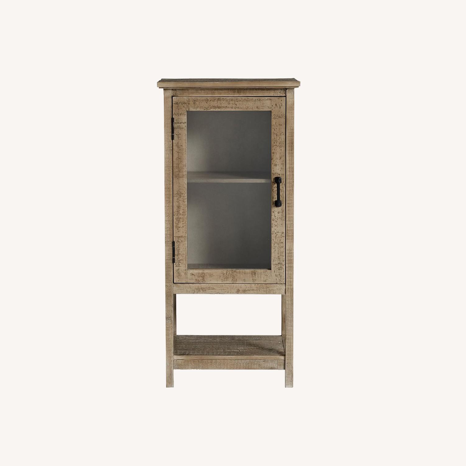 Seller's Notes:Crafted from reclaimed pine wood. Reclaimed wood features variations inherent to salvaged materials like distressed finishes, visible nailheads, knots, hairline cracks and oil stains, which may result in hue variations, rubbed edges, or other antique-like characteristics. Crafted of pine, a gorgeous softwood with a closed grain pattern. Finished in a Cinder Gray. Features 1 adjustable shelf behind tempered glass doors and 1 shelf on bottom for additional storage. Door handles are cast metal with a black finish; door has a magnetic closure. Cord cutout located on bottom of top panel.