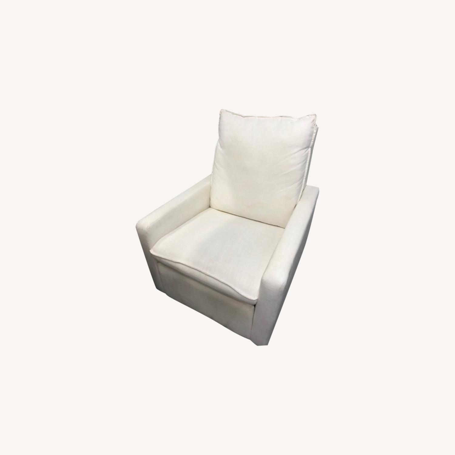 Seller's Notes:This contemporary twist on a classic recliner is a modern addition to any nursery. It’s carefully crafted from solid, sturdy pinewood for durability that’s safe and stylish. The convenient swivel feature gently and noiselessly helps you rock your baby to sleep while the reclining mechanisms are thoughtfully within easy reach so you can comfortably sit back and relax. HOW IT IS CONSTRUCTED Frame is crafted from solid pinewood and engineered wood. Corner-blocked frame provides exceptional structural integrity. Cushions are filled with polyurethane foam for a comfortable seat. No-sag sinuous steel springs provide cushion support. Kiln-dried wood helps prevent warping, splitting, cracking and developing mildew. Swivel base is made of metal. DETAILS THAT MATTER Chair reclines, glides and swivels 360°. Manual recliners equipped with recliner mechanism on the exterior right-hand side of arm rest. Manual recliner mechanism is designed to be virtually silent and can be easily used while holding your baby. Knife-edged back cushion is fixed; seat cushion is loose.