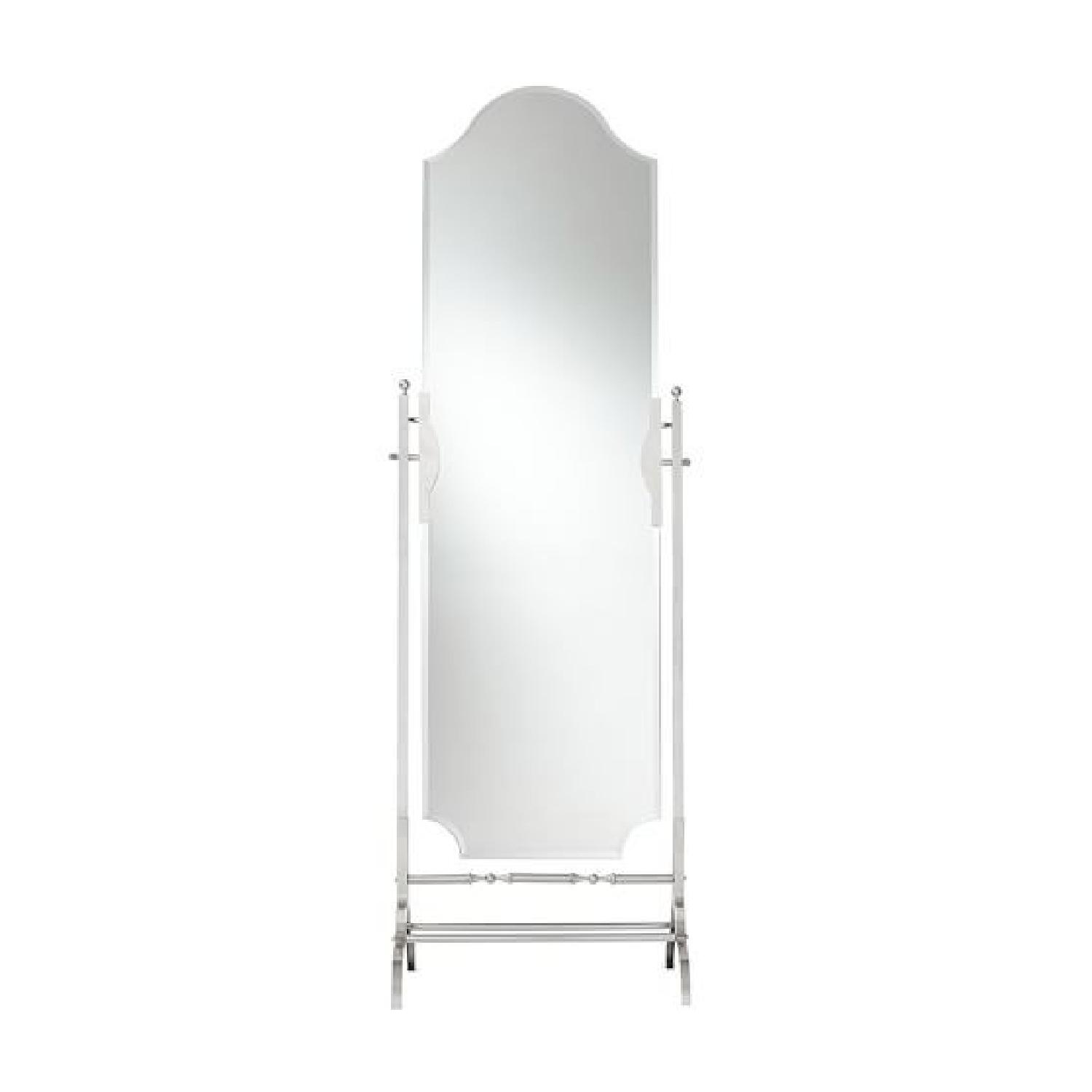 Seller's Notes:This mirror is in "like new" condition - it just doesn't fit anywhere in my new apartment. Beveled edges accentuate the graceful shape of our frameless floor mirror. Made of iron with mirror glass. Finished in Polished Nickel. DIMENSIONS Overall: 22.5" wide x 19" deep x 68.5" high CARE AND MAINTENANCE Wipe clean using a soft, dry cloth. To protect the finish, avoid household cleaners and abrasives. Clean mirror with standard glass cleaner.