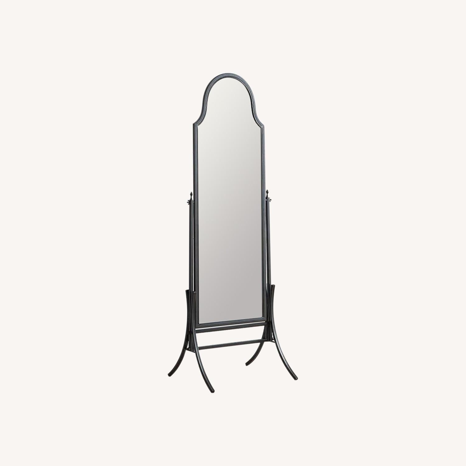 Seller's Notes:OVERVIEW A classic cheval design, our freestanding beveled mirror is framed atop a curved base. It pivots easily to catch the desired angle or the best light. Each piece is shaped by hand and one-of-a-kind. Made of iron with Medium-density fiberboard backing and mirror glass. DIMENSIONS Overall: 21.5" wide x 19" deep x 67.25" high Weight: 31 pounds. CARE AND MAINTENANCE Wipe with soft, damp cloth. CONDITION Excellent condition! Only selling because I no longer have room for it. Purchased for $599.