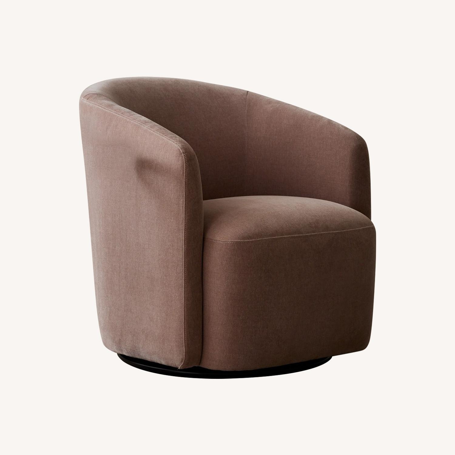 Seller's Notes:Gravender, Rustic Chenille Barrel arm. Swivel mechanism turns chair 360°, does not tilt. Fixed cushions. Polyester wrapped cushions provide a firmer feel. Grand swivel chair includes 2 throw pillows. Expertly crafted engineered wood frame with frame-and-panel construction, which provides exceptional structural integrity. No-sag steel sinuous springs provides cushion support.