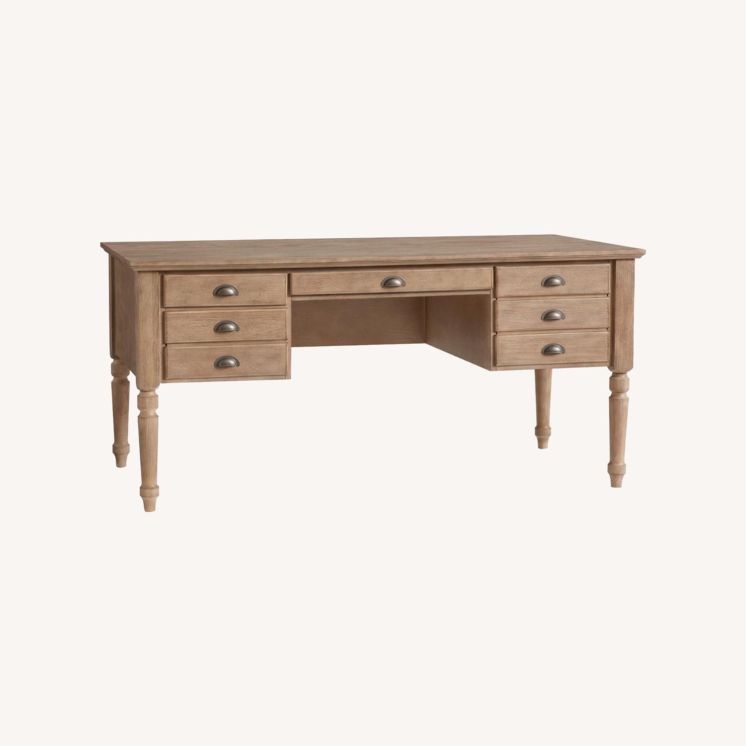 Seller's Notes:Tuscan Chestnut finished pieces are built from solid pine and pine veneer; hardware has an antique brass finish, all sides finished. Made with FSC®-certified wood. Your purchase helps support healthy forests and ecosystems worldwide for generations to come. Artisanal Black finished pieces are built from solid poplar and oak veneer; hardware has matching black finish, all sides finished. Seadrift finished pieces are build from solid ash, engineered wood, MDF and white oak veneers; hardware has an antique pewter finish, all sides finished. Crafted of pine, a gorgeous softwood with a closed grain pattern. Crafted of poplar, a medium-density hardwood that’s straight-grained and uniform in texture. Finish is hand-applied in layers, with distressing and burnished edges that give the collection the look of a well-loved antique. The keyhole desk has a drop-down keyboard tray flanked by a file drawer on the right and two smaller drawers on the left. Drawers open smoothly on metal glides. Cutouts in the drawer keep cords organized and easily accessible. Adjustable levelers provide stability on uneven surfaces. Imported.