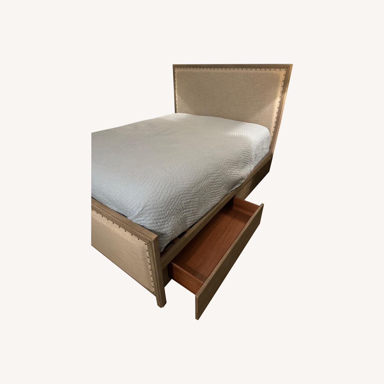 Seller's Notes:Queen sized bed with four large storage drawers (two on each side) purchased from pottery barn in 2019. Gray wash wood finish with upholstered headboard and footboard. Includes slat-roll support system. Bed is designed for use without a box spring. Drawers pull out effortlessly with wooden drawer glides. Metal brackets attaches the side rails to the headboard and footboard for easy installation. Minor pilling on the footboard and marking in one of the storage drawers.