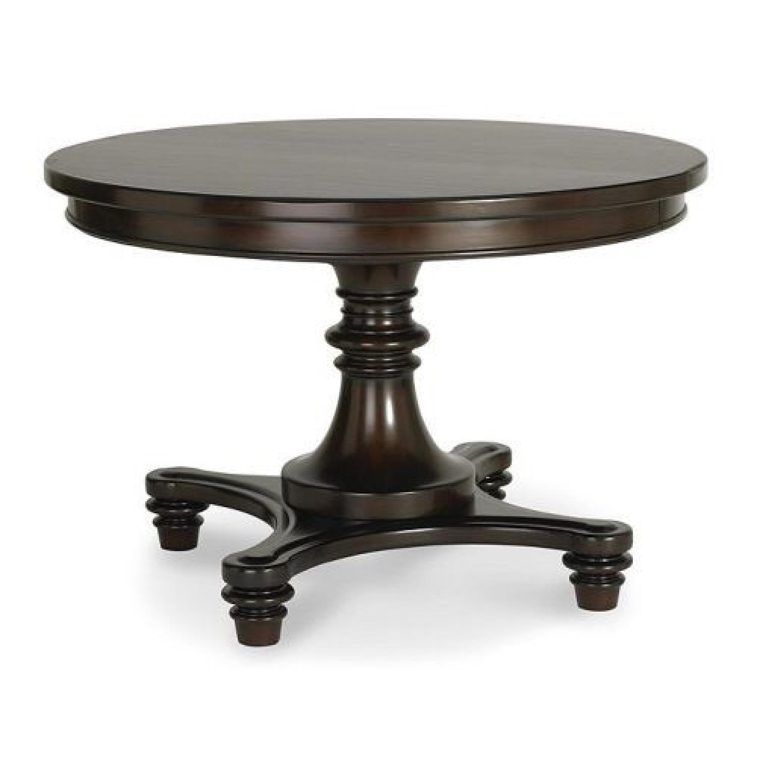 Seller's Notes:Round Pottery Barn dining table in dark brown. Includes 20 inch extension and protective case for extension. Top of table and edges in excellent condition. Base was damaged by puppy (see photos).
