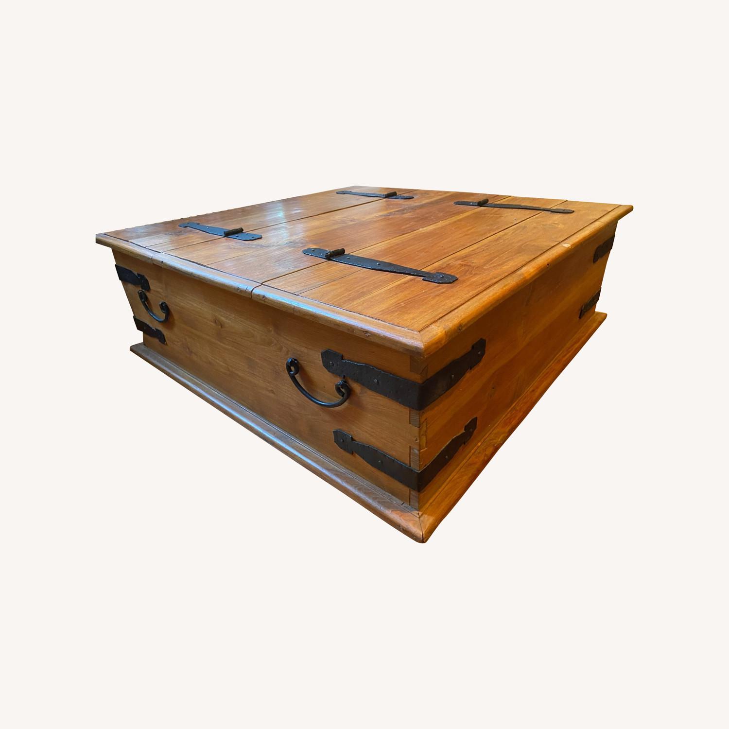 Seller's Notes:Wood square coffee table with antiqued hinges - looks great and provides ample storage space (the top opens up from both sides)