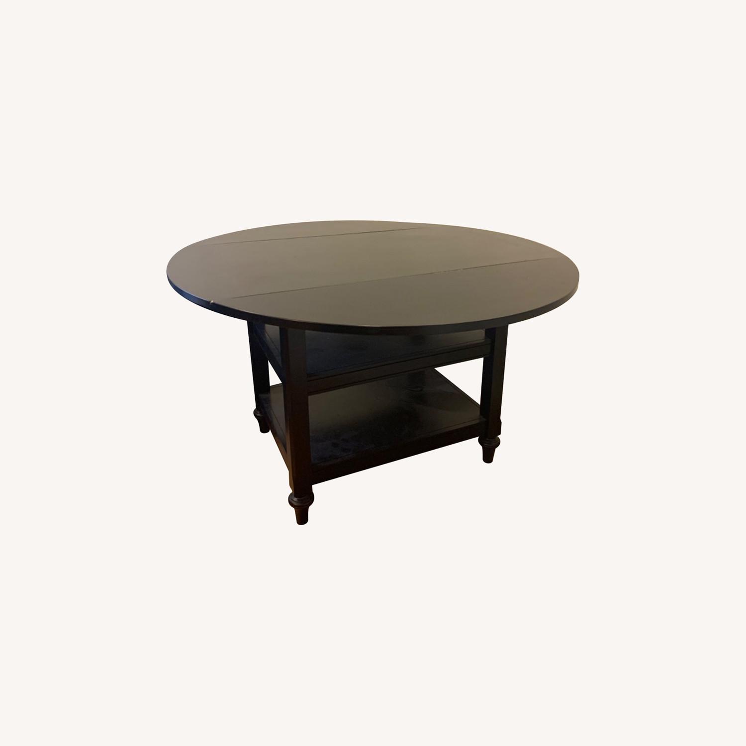 Seller's Notes:Great quality table! Both sides drop down easily to fit in smaller spaces. Can seat 5 people comfortably. Has shelves underneath for storage. Has a few chips (shown in pictures) from moving but could easily be filled in with a black sharpie!