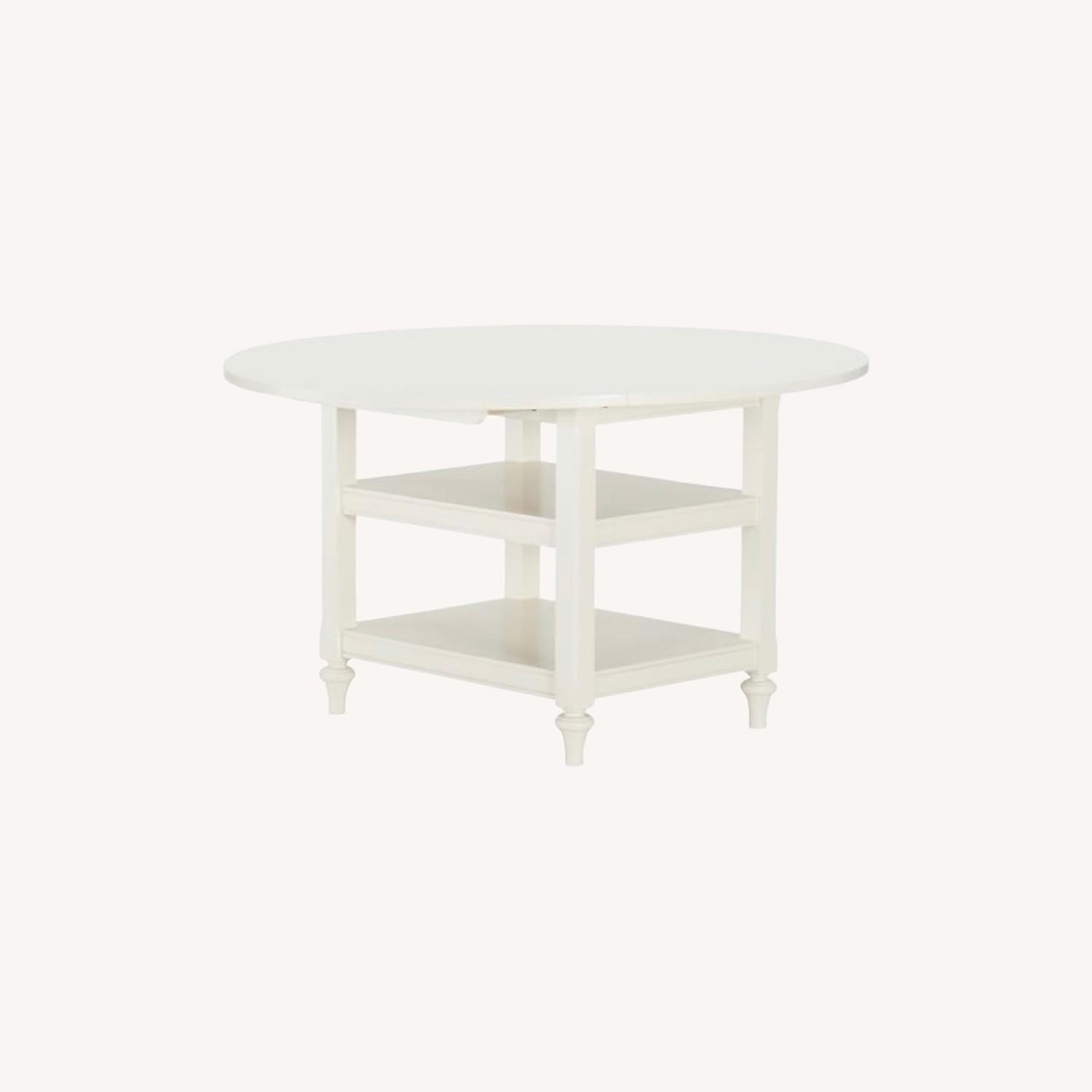 Seller's Notes:I am moving and need to sell this table. It is great as the leafs drop down for transition to large or small space. There is a shelf underneath for storage. I also have four chairs if interested for additional cost. Restoration hardware match perfect - 2 have sequin back and 2 are fully upholstered no sequin. Pictures shown.