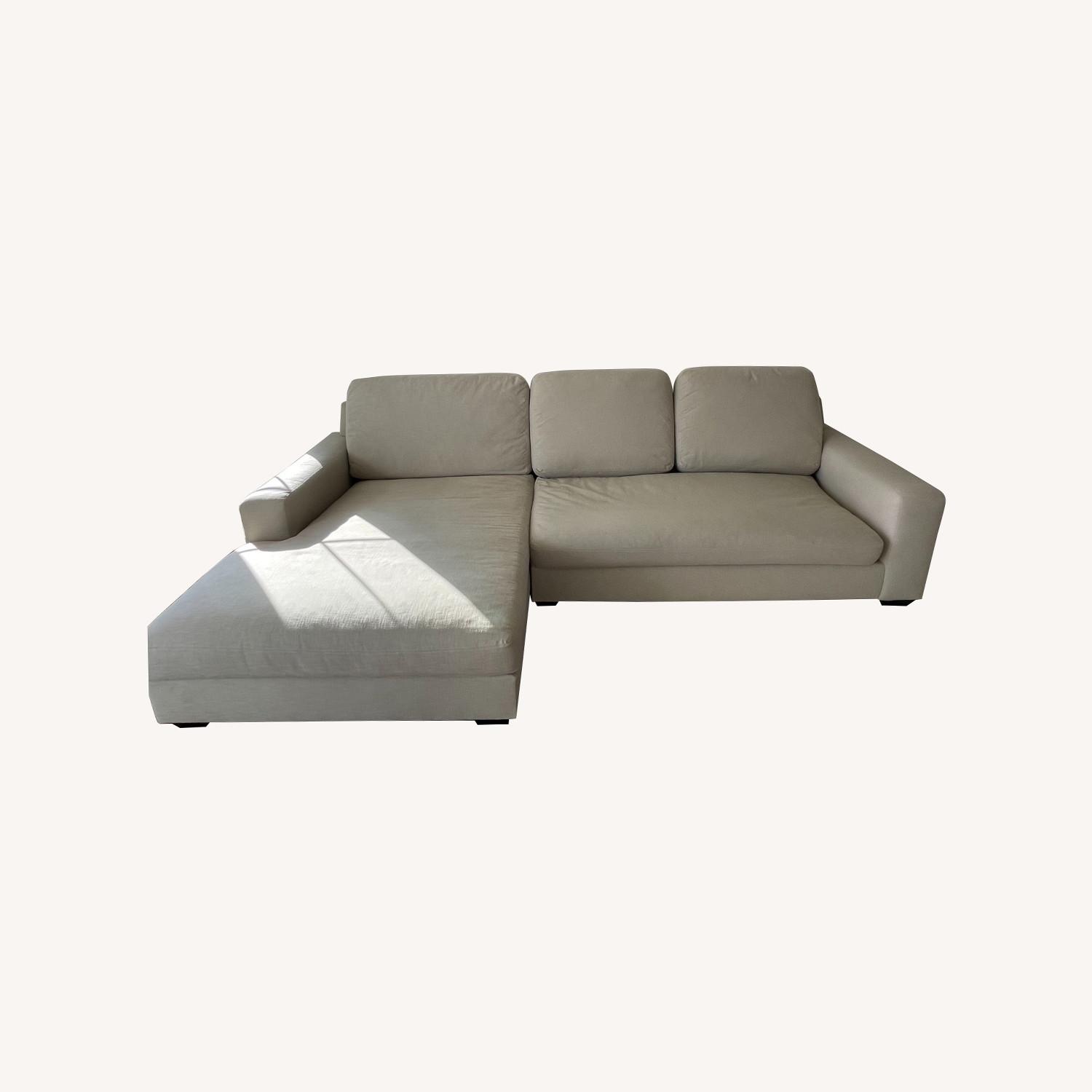 Seller's Notes:Used and like new Pottery Barn Big Sur Square Arm Upholstered Right Arm Loveseat with Double Chaise Sectional and Bench Cushion, Down Blend Wrapped Cushions, Performance Slub Cotton, Silver Taupe
