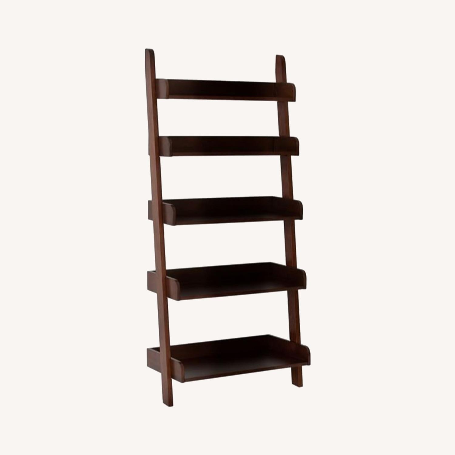 Seller's Notes:Owned this set of 2 wall shelves for 8 years. The past 6 years, they have been used in a subbasement with little to no contact. No moisture or water in the basement and regular cleaning, but very little wear and tear. We've loved these and they are the perfect size! Pottery barn no longer sells this color, but it is a lovely dark brown. From Pottery Barn's website: Our shelf is precisely engineered to be stronger and last longer than any other. Its deep shelves offer exceptionally generous storage space, and self-leveling feet and mounts at the top to provide stability. Posts are crafted from a single piece of solid poplar and covered with birch veneers (Antique White, Black and Espresso). Posts are crafted from a single piece of pine (Natural). Shelf is built from MDF, an engineered wood that lends exceptional strength and ensures the shelf’s structural integrity over time. Finish is hand applied using a multistep process that includes slight distressing on the edges. Overall: 33.75" wide x 17.75" deep x 75" high 1st Shelf (top): 31.25" wide x 9" deep 2nd Shelf: 31.25" wide x 10.75" deep x 7.75" high 3rd Shelf: 31.25" wide x 12.75" deep x 10" high 4th Shelf: 31.25" wide x 15.25" deep x 11.25" high 5th Shelf (bottom): 31.25" wide x 17.75" deep x 13" high Clearance from bottom shelf to floor: 6.5" Legs: 1" thick, 3" deep Distance between legs: 31.5" Shelf weight capacity: 50 pounds each shelf Weight: 61 pounds