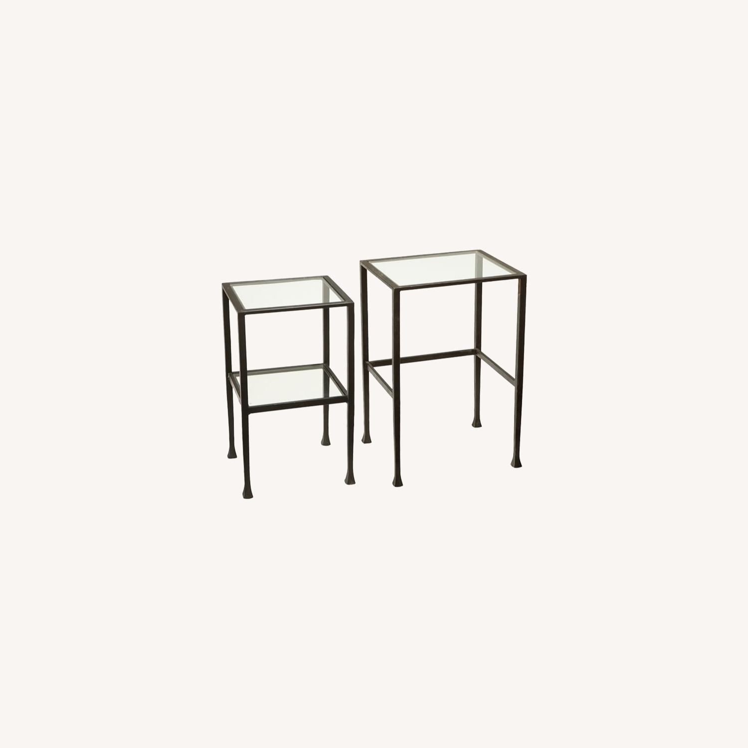 Seller's Notes:Each piece in the Tanner Collection has hand-hammered iron frames inset with tempered glass. Perfect for showcasing collectibles or displaying books, they have streamlined shapes that work great in smaller spaces. The versatile nesting tables are handy when you need to create extra space when entertaining guests. Crafted of iron with a tempered glass top. Hand finished in rust resistant blackened bronze on all sides. Adjustable levelers provide stability on uneven surfaces. Set of 2 tables. Simple assembly required. Imported. DIMENSIONS Small Table Overall: 13" square, 22.5" high Clearance Above Shelf: 11" Distance Between Legs: 11.5" (front/back); 12.5" (side to side) Weight: 12 pounds Large Table Overall: 14" wide x 16" deep x 24" high Distance Between Legs: 11.5" (front/back); 14.5" (side to side) Weight: 14 pounds CARE AND MAINTENANCE To clean, wipe with a soft, damp cloth. Avoid the use of chemical and abrasive cleaners. Glass cleaner may be used to clean glass shelves, but avoid spraying it onto the metal frame. Wipe up spills immediately. Be sure and check out the matching coffee table for sale! https://www.aptdeco.com/product/pottery-barn-tanner-rectangular-coffee-table-13