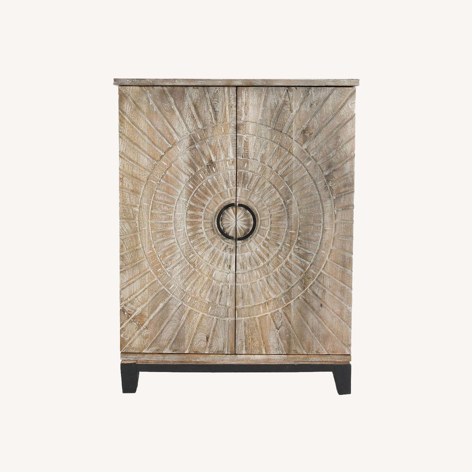Seller's Notes:Expertly crafted of solid mango wood and finished in water-based Dark Walnut, Vintage Gray or White Wash. Cabinet includes 1 fixed shelf, 5 stemware racks and 18 cubbies for bottle storage. Magnets keep doors secured. Pulls are crafted of iron and finished in Black or Brass. Kiln-dried wood helps prevent warping, splitting, cracking and developing mildew. Our mango wood is sourced sustainably from orchard trees that no longer bear fruit, that would otherwise be cleared to make room for younger, more productive trees. Mortise-and-tenon joinery provides exceptional structural integrity. Adjustable levelers provide stability on uneven surfaces.