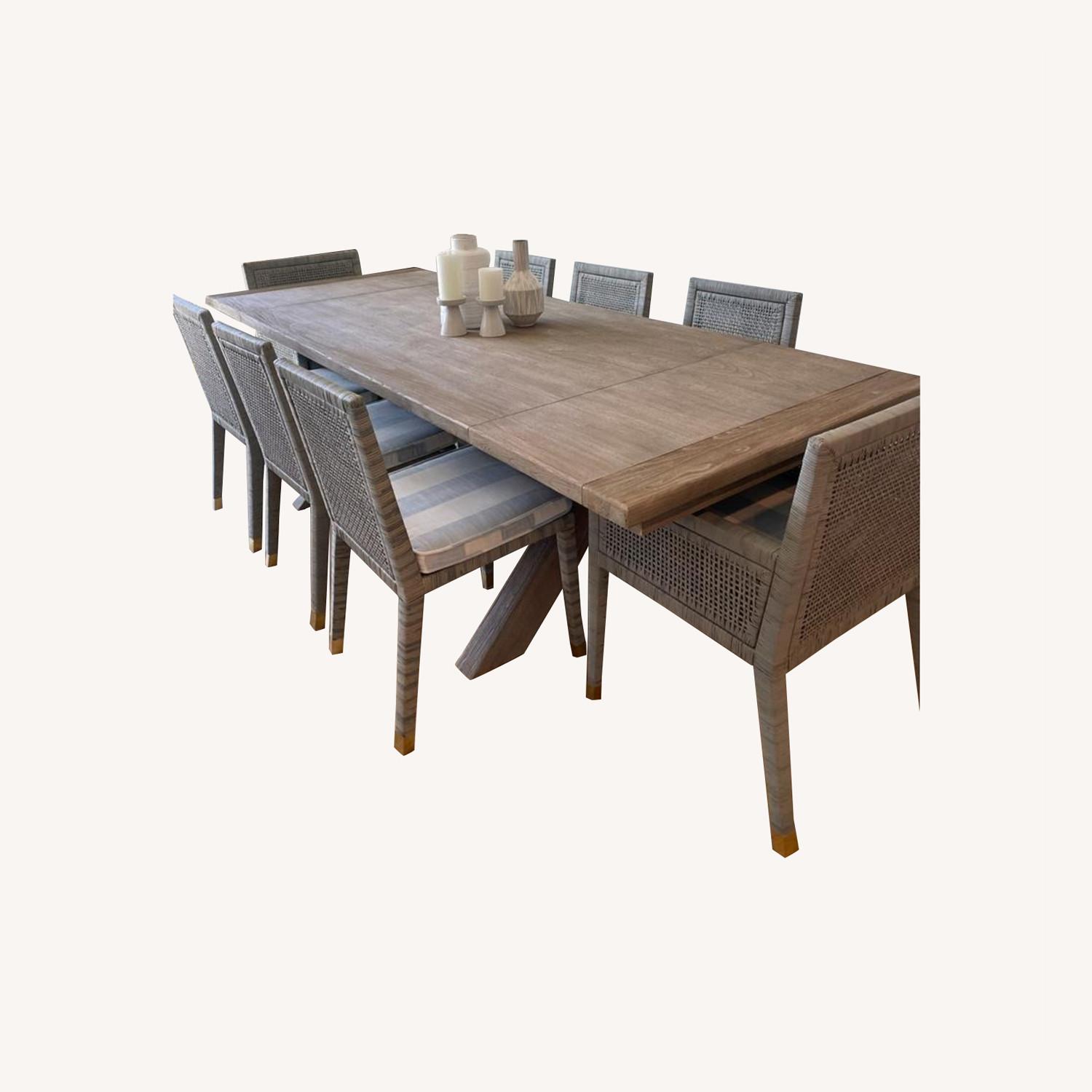 Seller's Notes:Table + 8 chairs - will discount the whole set to $4,800 POTTERY BARN TABLE: https://www.potterybarn.com/products/toscana-extending-dining-table-seadrift/ Finish: Gray Wash Size: 74" - 104" L Condition: Like NEW; barely used Price: $1,300 for the table ALSO SELLING the the 6 side chairs and 2 arm chairs in the photos SERENA & LILY SIDE CHAIRS: https://www.serenaandlily.com/balboa-side-chair---mist/m12447.html Mist with Coastal Blue Cushion Condition: Like NEW; barely used Price: discounted to $3,000 for all 6 chairs SERENA & LILY ARM CHAIRS: https://www.serenaandlily.com/balboa-armchair---mist/m12448.html Mist with Coastal Blue Cushion Condition: Like NEW; barely used Price: discounted to $1,000 for both chairs