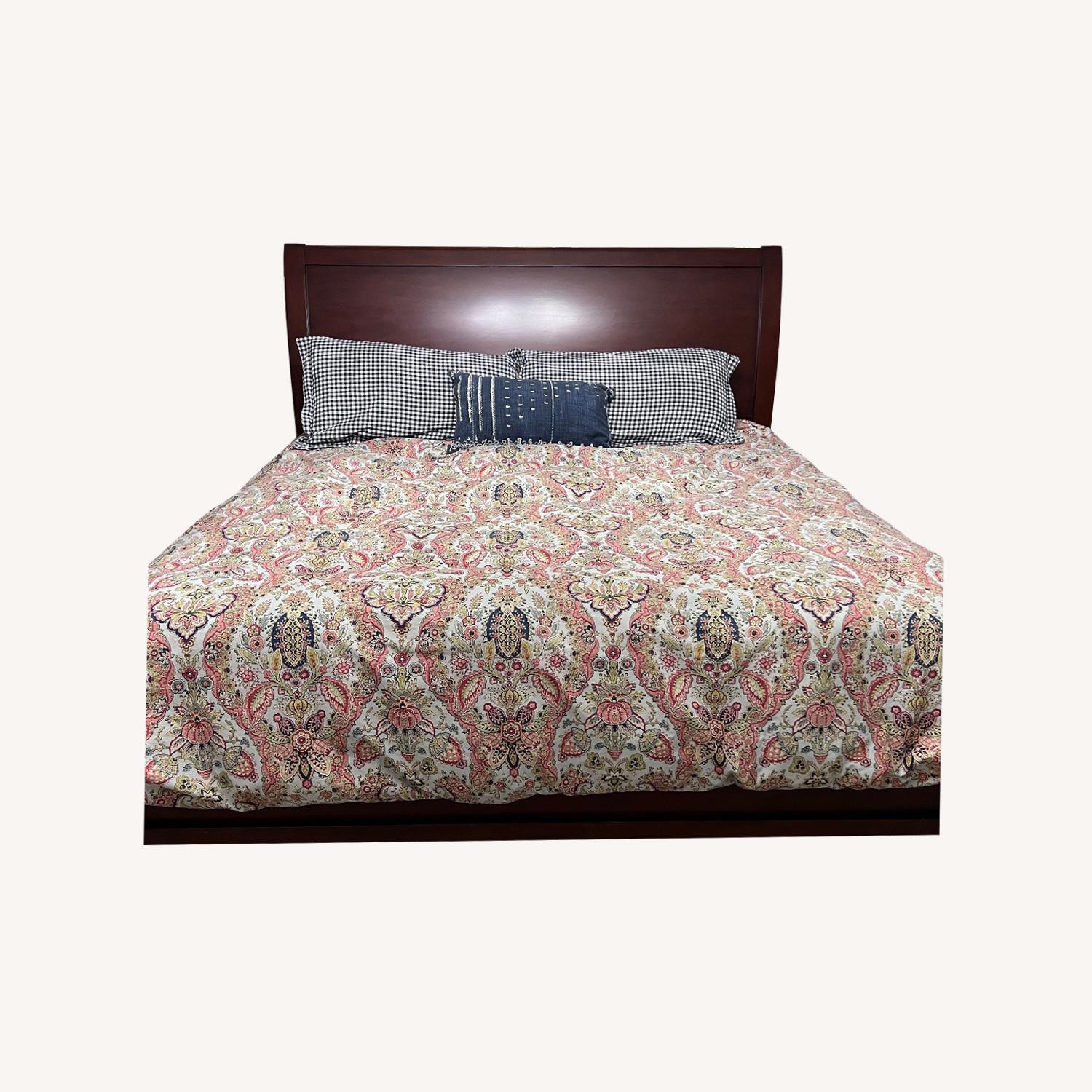 Seller's Notes:Pottery Barn Valencia II Sleigh Bed, King, Mahogany stain. Item #: 3003886. Purchased in May 2018. Wonderful bed and fit well in our previous bedroom. Stable, no noise or rocking, beautiful stain color. In our new home, the headboard blocks the light from the window, so we've purchased a new bed, and that is the only reason for the change. The bed is in great shape, one pinpoint blemish on headboard, and one scratch on inside of frame that is not visible once boxspring/mattress in place. No missing hardware. Breaks down into stained headboard, footboard, and two side pieces. There are 5 horizontal slats with stained supports, and the slats screw into the side pieces of the frame.