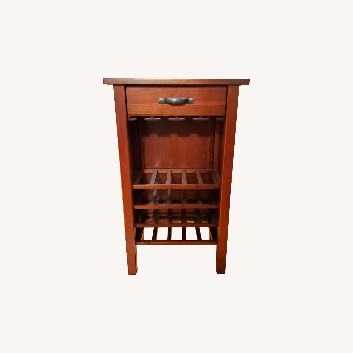 Seller's Notes:This great bar cabinet has 4 stemware racks, 4 5-bottle racks, a large drawer, and a large top shelf that can handle more glasses, bottles, and bar accessories. It has a nice reddish wood, somewhat rustic feel. Perfect for an apartment.