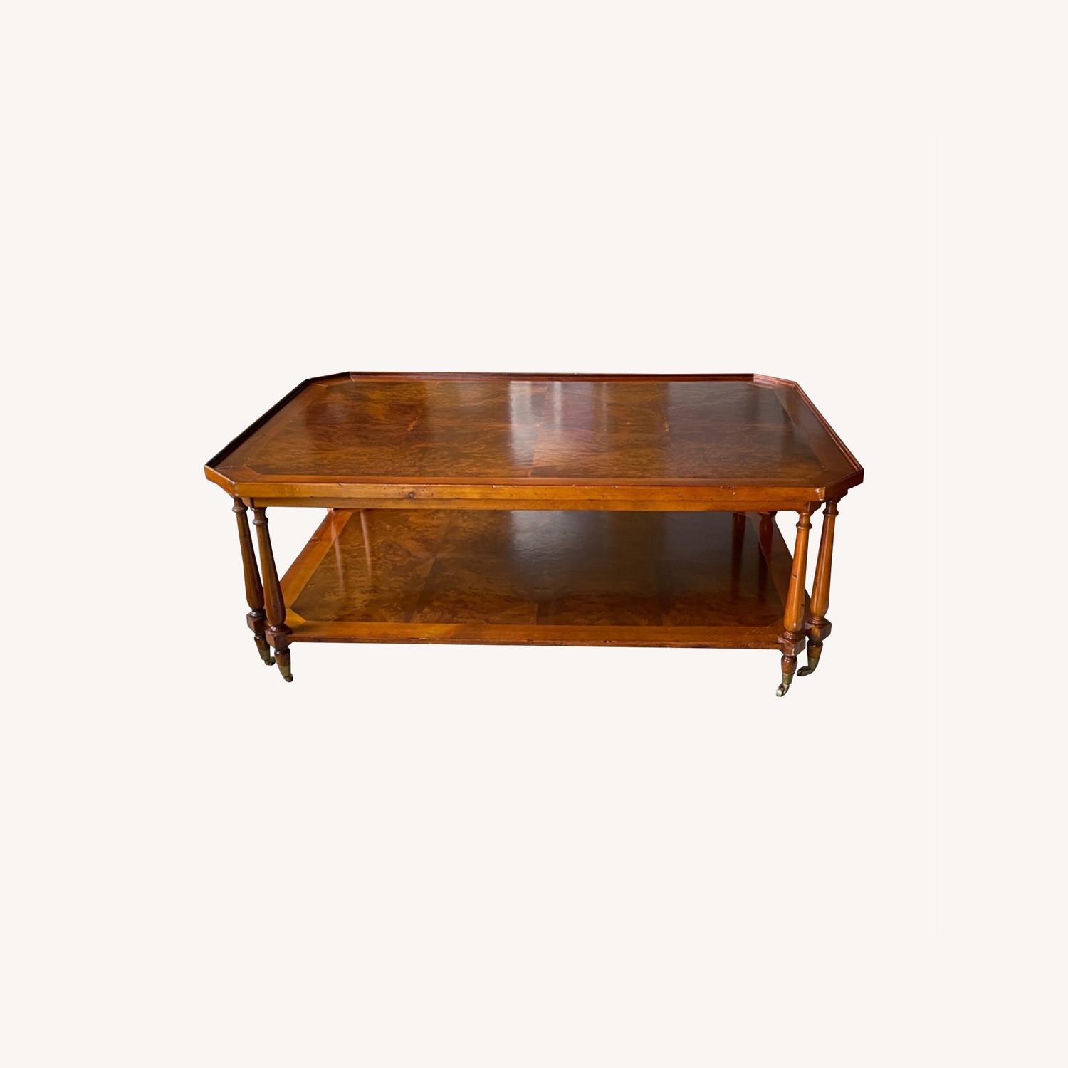 Seller's Notes:Two tier coffee table with brass casters. It is from Pottery Barn made from two woods. Walnut inside and Cherry border on the outside. It’s in very good condition with very few marks from vacume. It’s movable, practical and beautiful in a classical surroundings.