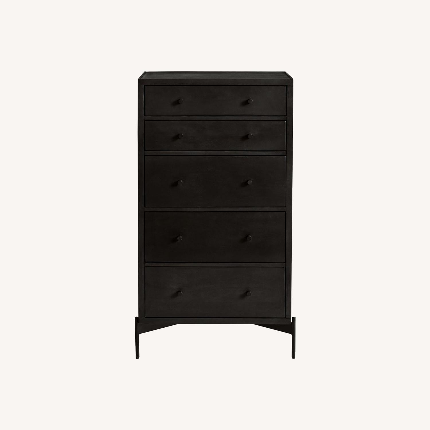 Seller's Notes:Expertly crafted from solid Acacia wood. Crafted of acacia, a highly durable and water-resistant hardwood with an eye-catching grain. Kiln-dried wood helps prevent warping, splitting, cracking and developing mildew. Legs are made from iron; powder coat finish in black. Knob is made from metal and finished in black. Features five spacious drawers. Drawers feature English dovetail joinery and metal glides, which ensure smooth motion. Sturdy half-moon safety stops keep drawers securely in place. Adjustable levelers provide stability on uneven surfaces.