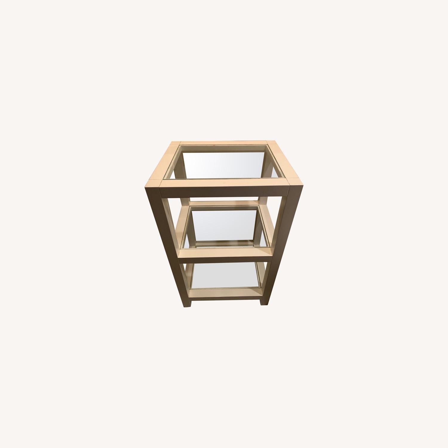 Seller's Notes:White bathroom organizer/shelving fixture with glass shelves. Some light scratches otherwise in good condition.