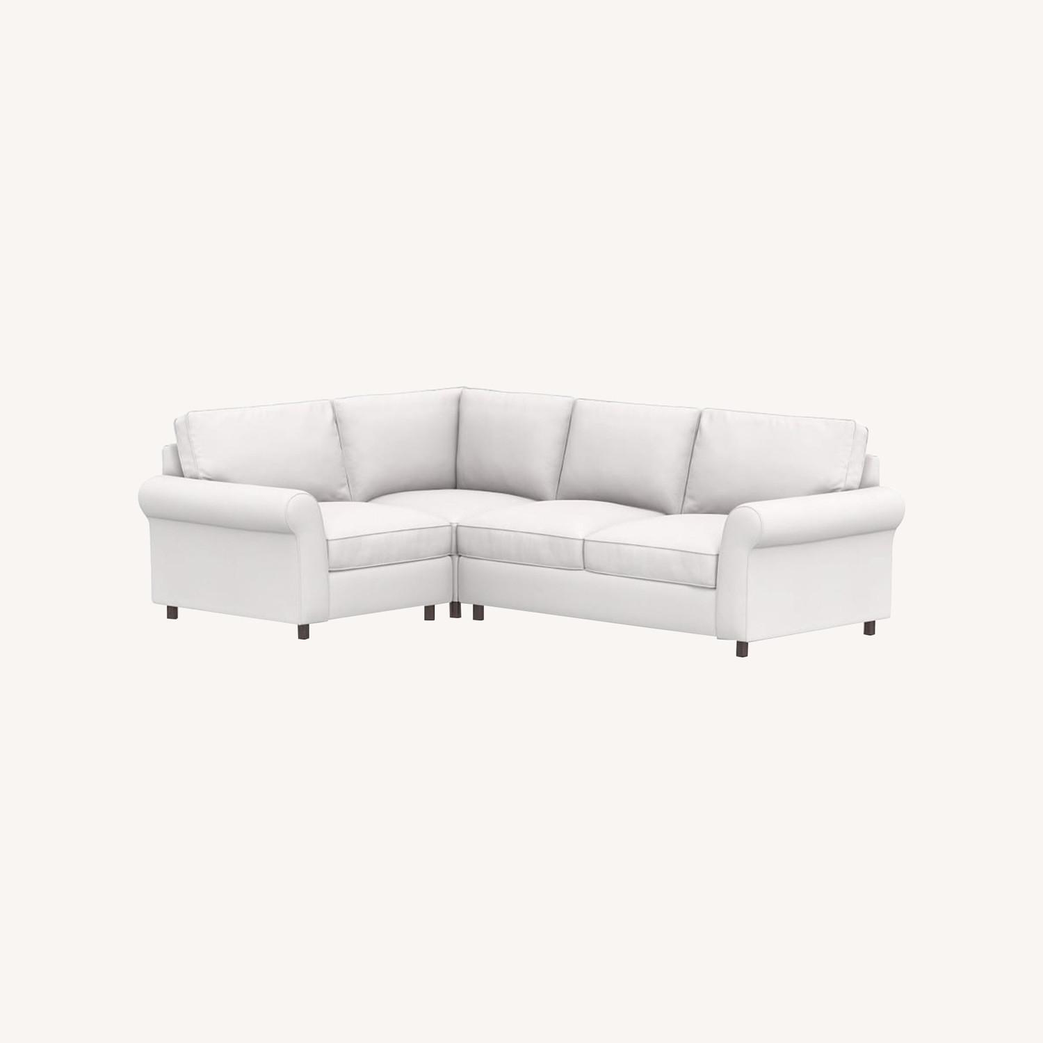Hi! We LOVED this gorgeous, PB Comfort Roll Arm Upholstered 3-Piece Sectional (in white fabric). While there is some discoloration and small stains, I would keep it if I could (unfortunately it is too large for our new place!). PICK UP IS ON GROUND LEVEL STORAGE UNIT IN EAST HARTFORD, CT. Discoloration/stains: There is discoloration so I would recommend a slip cover. We dropped a bit of chocolate on one of the cushions (which I then made much worse in my failed attempts to remove the stain), but as you can see in the photos, a strategically placed throw blanket or pillow disguises the issue. Shortly after these (staged) pictures were taken, we moved it into a storage unit. I went to the unit yesterday to take pictures -- as you can see it was wrapped pretty well, but there are some stains and discoloration where the wrapping ripped. Some might very well come out, but I am not going to try considering my failed attempts earlier :) If I were keeping it, I would personally have a cover custom made for it as it does seem a bit worse for the wear than before we put it into storage. I can throw in one or two of the pottery barn throw blankets (laudered professionally), if you'd like to take our approach to camouflaging the signs of wear. ;) It's super comfortable and I don't recall feeling any kind of sagging in the cushions. This is the original listing (below), but please note that it shows a smaller version. In the listing, you will see a 2 seat piece, a corner piece, and then a 1 seater piece. Rather than this configuration, we purchased two of the 2 seaters and the corner. You can see this in the pictures from our home before we moved. Please account for this difference when looking at the measurements. https://www.potterybarn.com/products/pb-comfort-upholstered-3-piece-sectional/?catalogId=84&sku=2875870&cm_ven=PLA&cm_cat=Google&cm_pla=Furniture%20%3E%20Sectional%20Sofas®ion_id=658780&cm_ite=2875870_14552546110&gclid=EAIaIQobChMI2Pnm2I2hgQMVFs7jBx2Nm