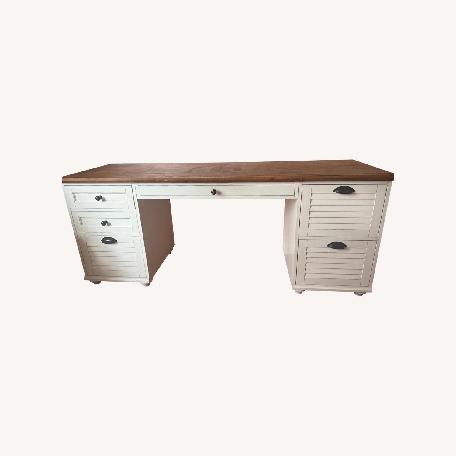 Seller's Notes:Beautiful Pottery Barn Executive desk with plenty pf storage for documents. High quality wood. Has a small water stain on top.