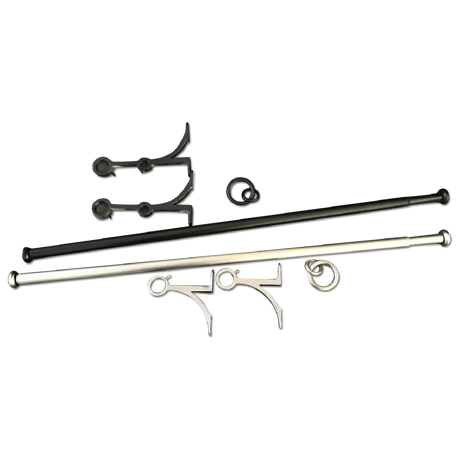 Seller's Notes:PB Standard double drape rods and brackets with endcap finials. Rings included. Small (28-48"). Antique bronze finish. Small paint marks that could be removed.