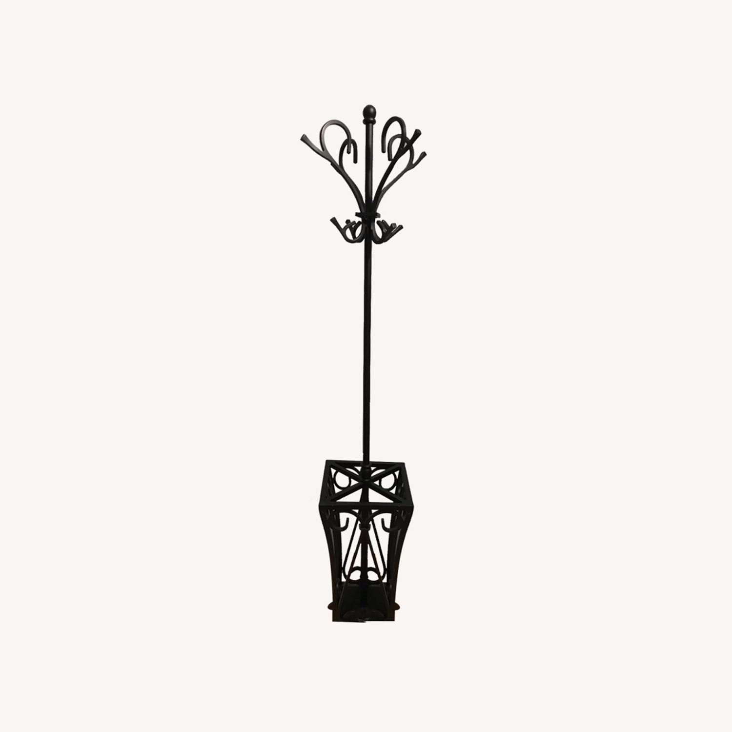 Seller's Notes:Perfect coat rack to use in a foyer. Top hold coats, jackets, hats. Bottom holds umbrellas. Very strong; won't tip over. Matte black wrought iron. You will love it!