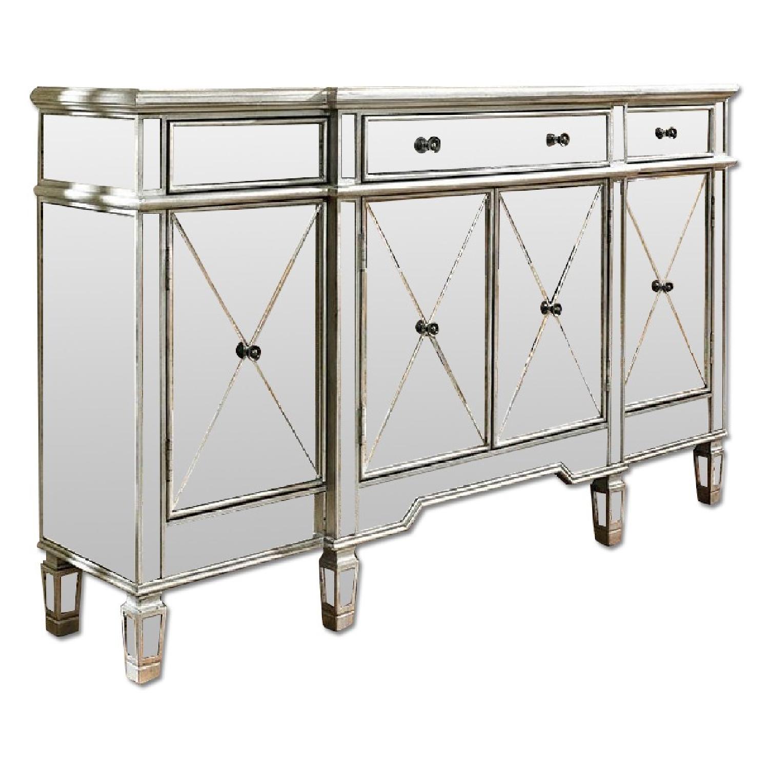 Seller's Notes:MIRRORED 3 DRAWER 4 DOOR CONSOLE The Mirrored Three Drawer, Four Door Console will instantly add a bit of glitz and glamour to your home. Perfect for adding to your living room or bedroom, the console provides ample interior storage space and a wide display area. The silver wood and mirror leaves this piece open to any design style and color. An easy way to add eyecatching drama to your home decor
