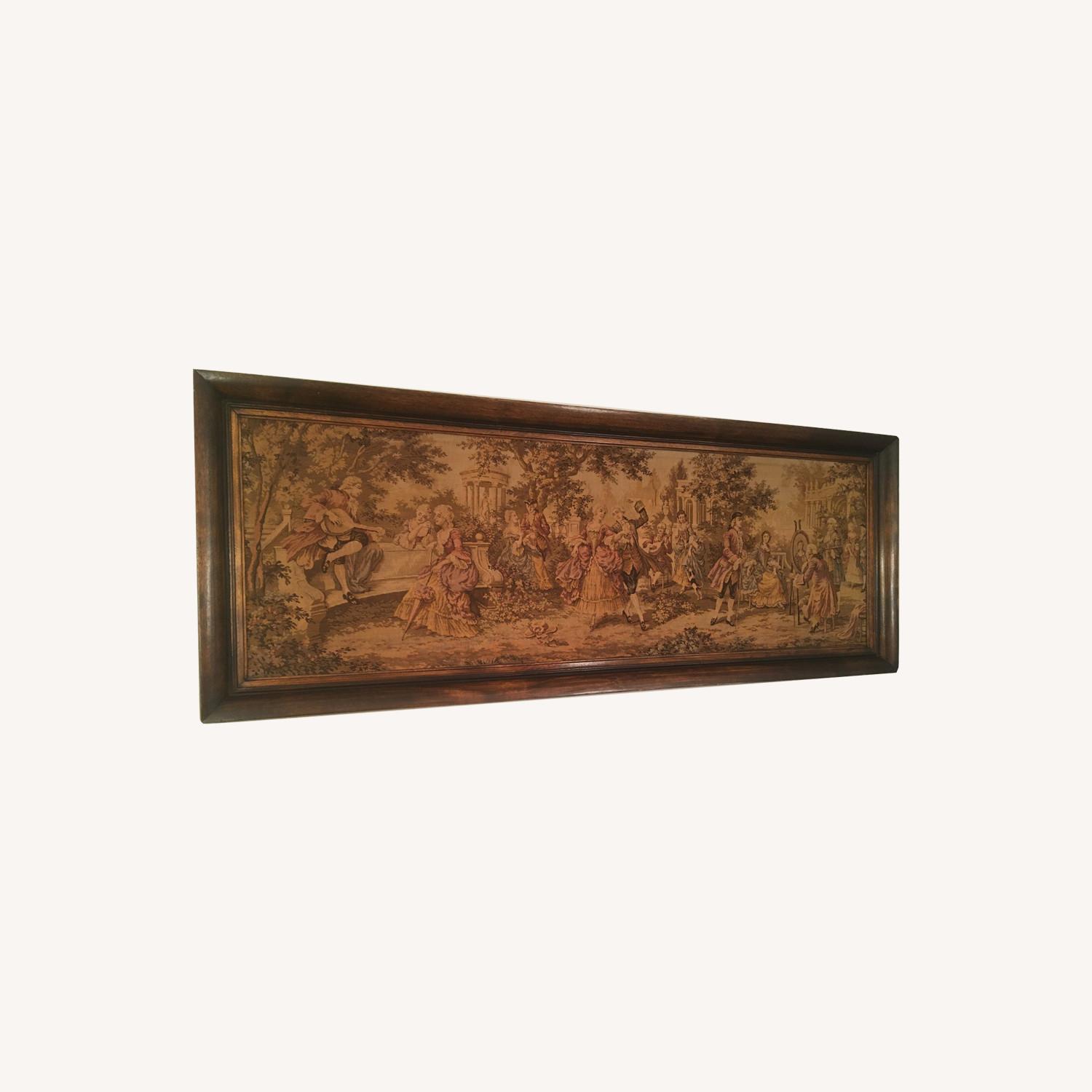 Seller's Notes:This is a beautiful Victorian style wood framed Flemish tapestry from Belgium. My family purchased it at an antique/flea market in Belgium in the early '90s. It would be a beautiful focal point in an antique furnished parlor or Victorian style home. We simply do not have room for this tapestry in our apartment. It has not been hung for many years. This item was appraised 10 years ago but we do not have the official appraisal unfortunately. Condition: As seen in the photos, this tapestry and the frame is in excellent condition. Minor issues at the back of the frame: 1) top and bottom of the back frame a small nail hole with small crack. A few nail holes in the back. Period: Definitely a Pre WWII item possibly older Measurements Tapestry: 56 inches width x 18 inches height Frame: 61.25 inches width x 23.25 inches height