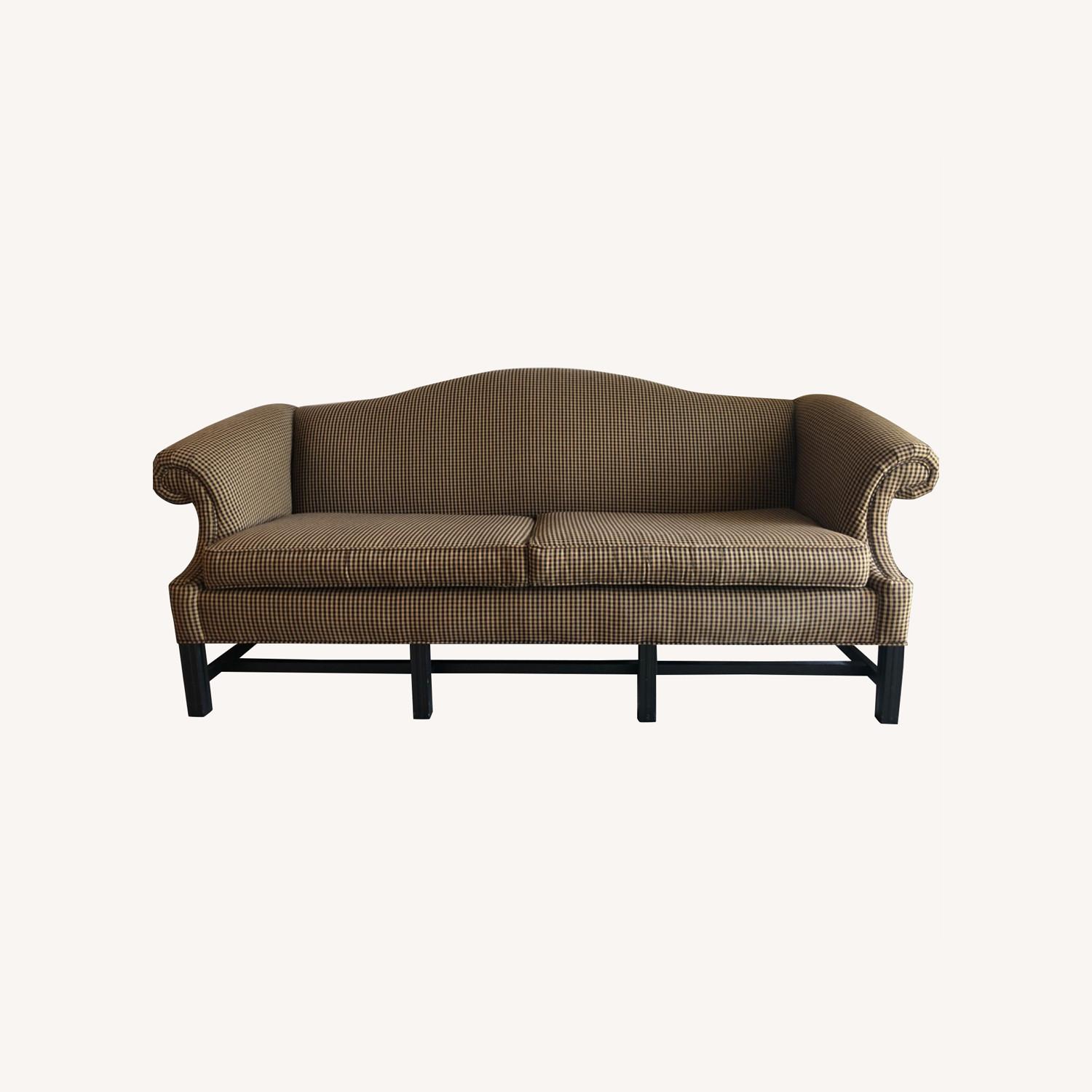 Seller's Notes:This Black & Tan Checkered Primitive Country Sofa is 4 years and 10 months old and was purchased at Kraemer Brothers Furniture in Annville, PA and was made at Friendship Upholstery Inc. in Taylorsville, NC. There are no tears, no rips, no holes, no stains, and no fading. The are some minor dings in the black legs.