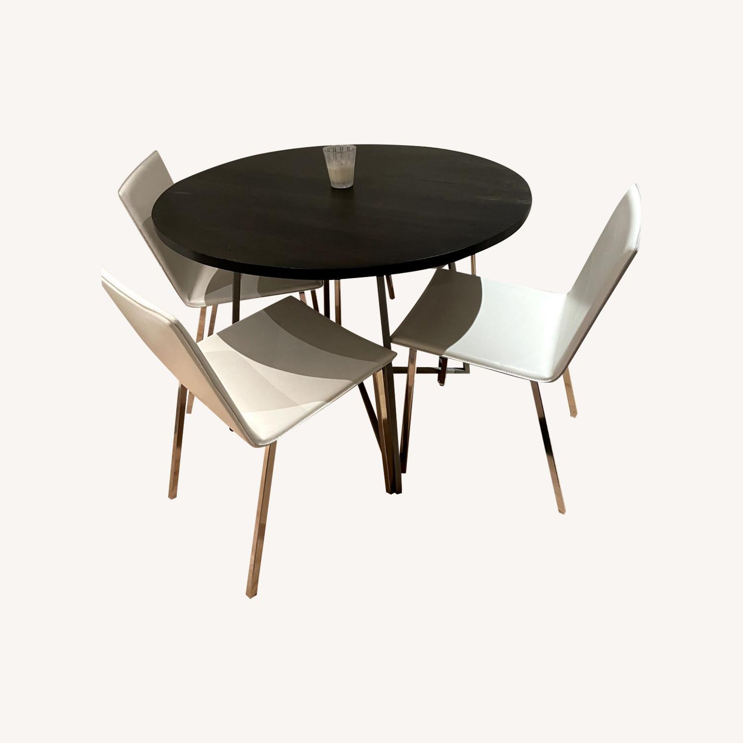 Seller's Notes:CB2 Dining Table in pristine condition for sale. Accomodates four chairs and is 40 inches in diameter and 30 inches in height. No blemishes or sign of any wear. Table is perfect for a small space!