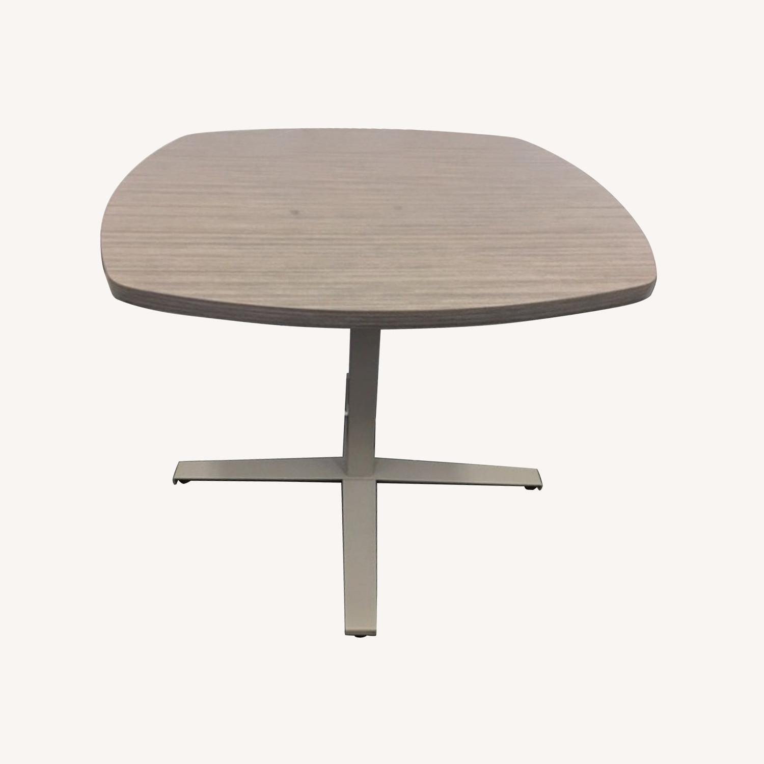 Seller's Notes:AIS Manufacturer - Private Office Meeting Tables (2) - 29"H x 33"W X 33"W - Laminate top: Absolute Acajou; Metal legs: Tan - Four feet