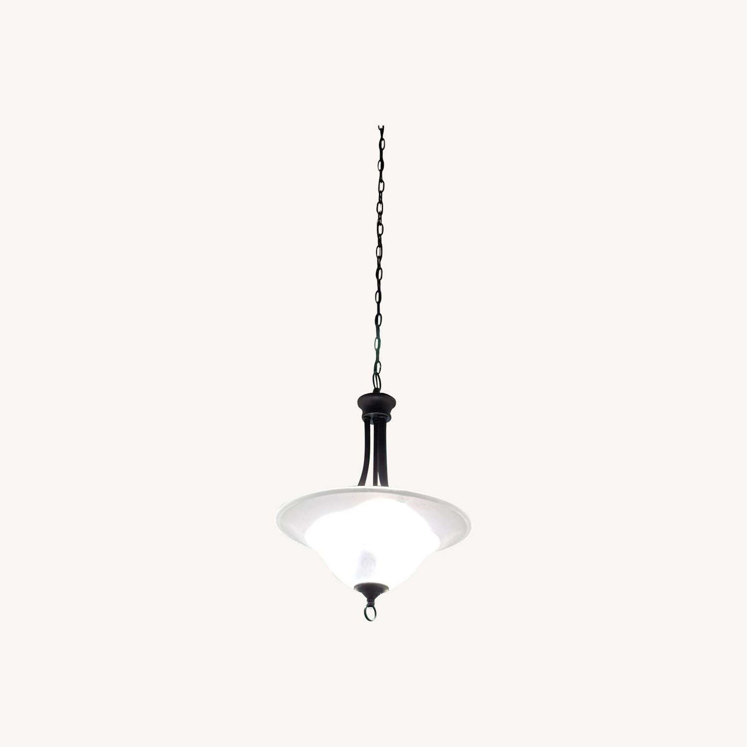 Three-light hall and foyer fixture featuring soft angles, curving lines and etched glass shades. Gracefully exotic, the Trinity Collection offers classic sophistication for transitional interiors. Sculptural forms of metal and glass are enhanced by a classic finish. This transitional style can transform a room or your whole home with its charming versatility. Antique Bronze finish.