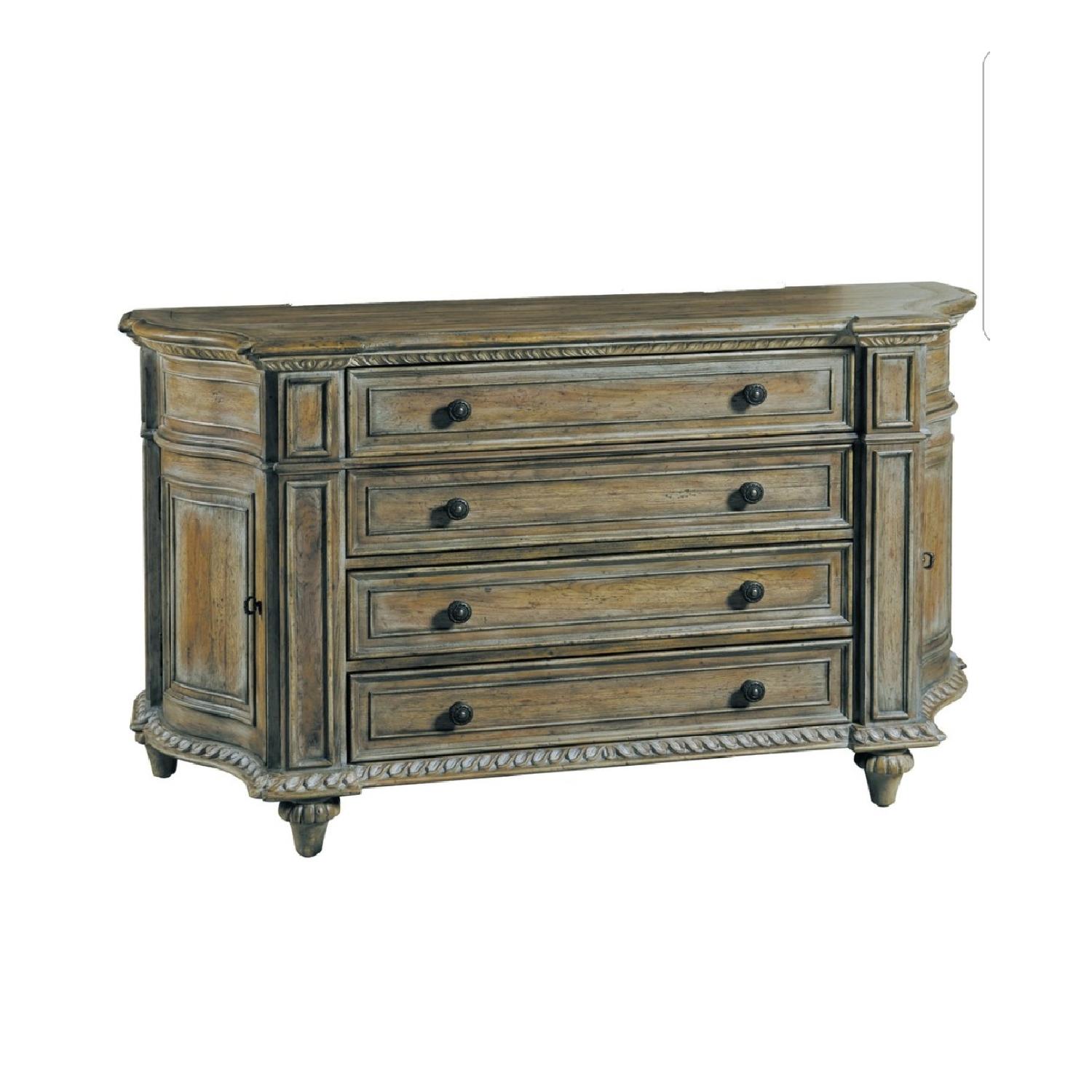 Seller's Notes:Brand new, unopened in original packaging. Add charming storage utility in your bedroom with the Pulaski Arabella 4-Drawer Dresser. Elegant rustic design is crafted from solid hardwood and boasts a graceful curved silhouette, intricate carved decorative molding, 4 wide drawers, plus side cabinets. Pulaski Arabella 4-Drawer Dresser combines rustic elegance and charming sophistication to offer splendid storage utility to any private haven for resting and slumber Offers ample storage space with 4 wide drawers and cabinets on each side Drawers smoothly slide along ball bearing glides Side cabinets features adjustable interior shelves Intricate decorative molding Pecan veneer panels Antique Bronze metal hardware Carved tapering feet Crafted from solid hardwood Aged Grey/Brown patina finish Wood and veneer construction Assembly required Measures 22" D x 68" W x 38" H Mirror shown in picture is not included 1-year manufacturer's warranty Imported