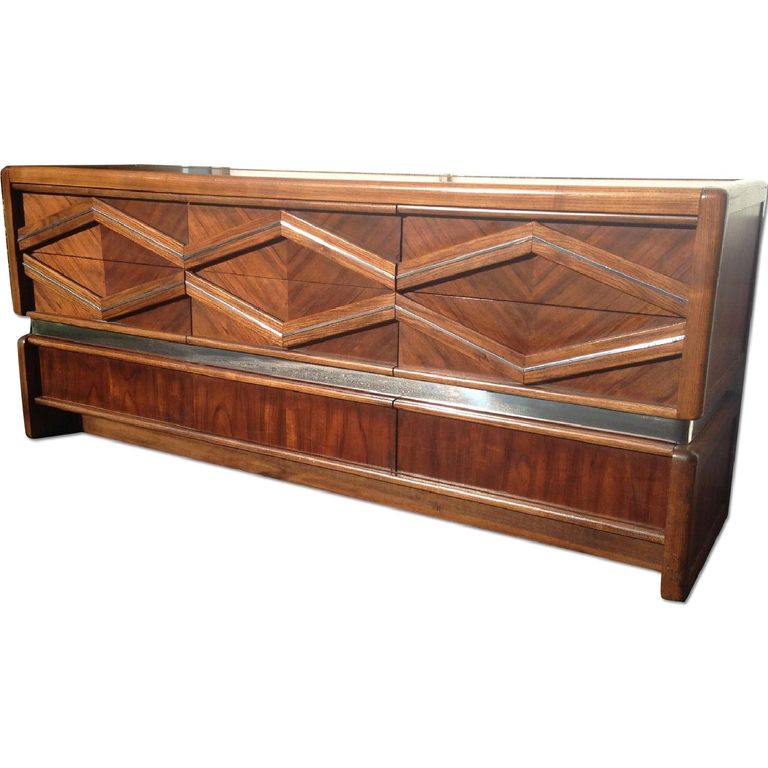 Seller's Notes:Unique diamond front dresser by Pulaski Furniture features nine spacious drawers for storage, unique sculptural front drawers, and retro chrome trim. Some light age appropriate wear, scuffs, finish wear, etc. light restoration recommended. Dimensions: 74w 20d 31h.