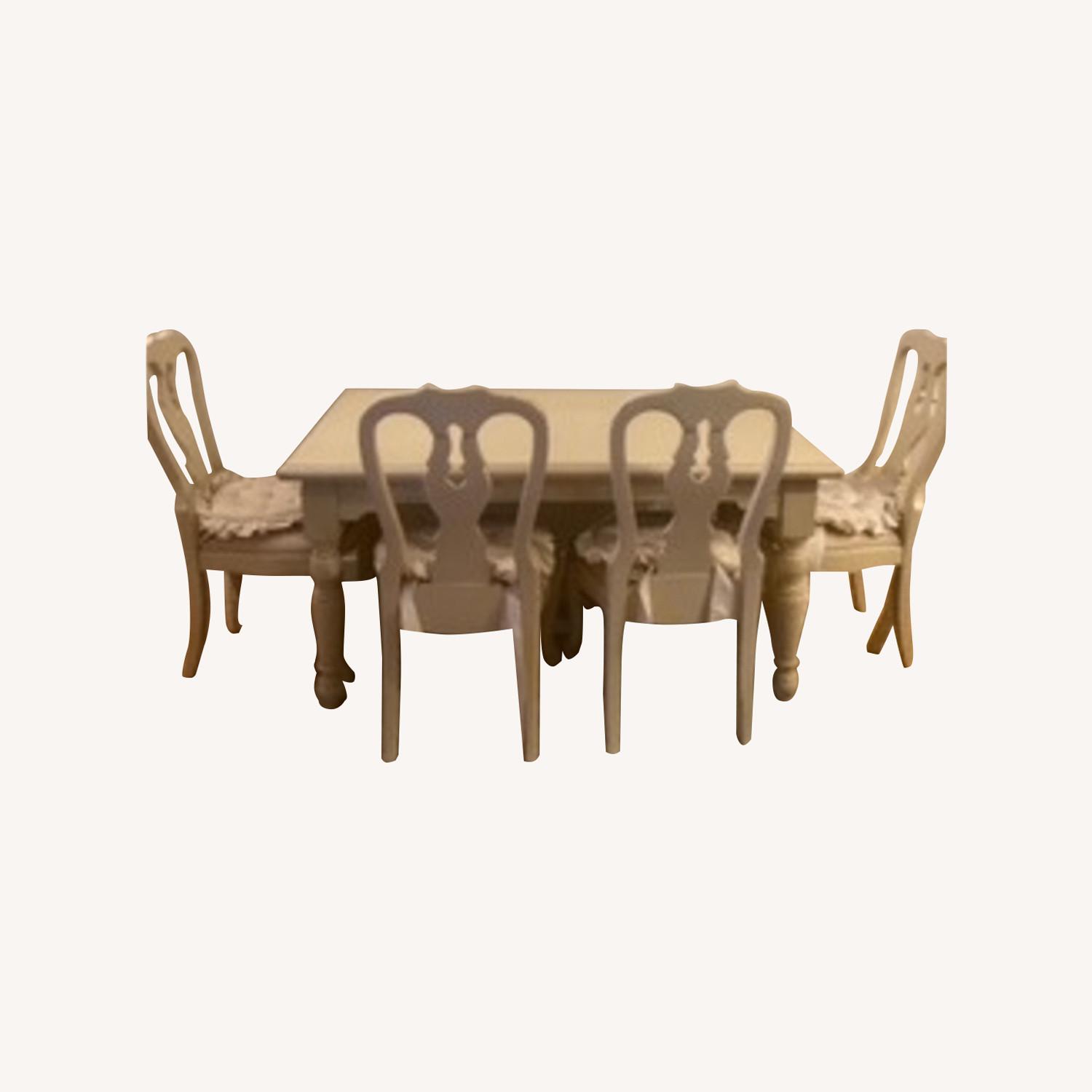 Seller's Notes:This rectangular Pottery Barn dining room set was purchased new, then placed in storage for the better part of the past decade because of a life change. Thus hardly ever used. Cream color, solid spruce legs, 59x36x30 size is as new as buying used furniture can get because of (see above).