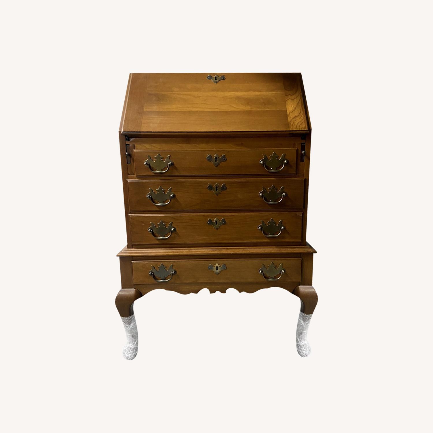 Seller's Notes:This charming Queen Anne Secretary Desk was made in 1940's, it has a Traditional style design, queen anne legs, and made of solid maple wood. Hidden inside the drop-front front are three small drawers and small compartments for organization. Very good condition; minor scratches. Please note only the drop-front and bottom drawer opens; the three center drawers do not open. No key. Additional Sizes: Desk drop-front: 22.5"W x 16.25"L Desk insert: 20.5"W x 8.25"W Bottom Drawer: 21"W x 3.5"H x 12"D