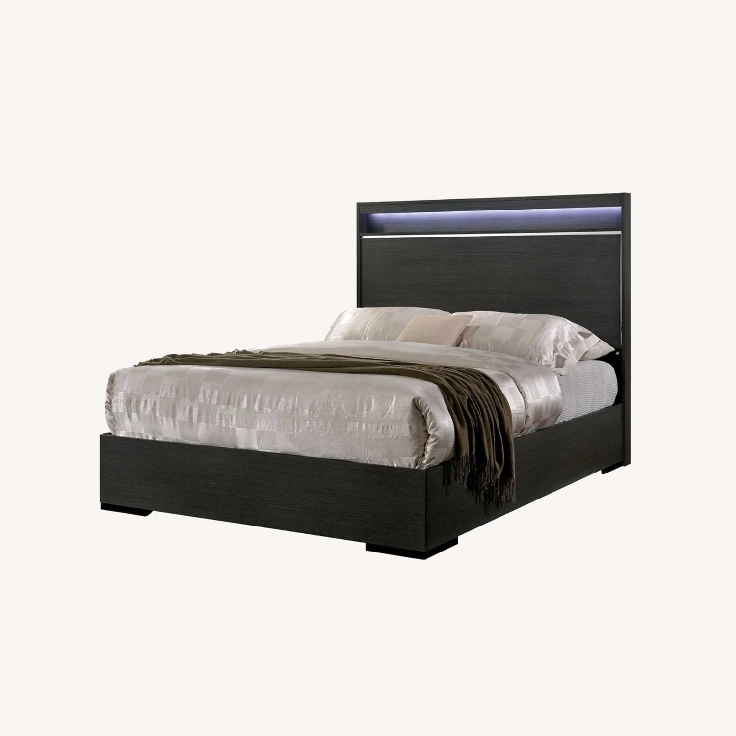 Seller's Notes:Redesigning my current space and getting rid of all my furniture! Bought brand new in Nov 2021, this bed has no damage/wear and tear, it's in prime condition! Shelf and LED light work great. Also selling the matching nightstands and dresser. Website Description: Contemporary style bedroom set available in dark gray veneer finish. Offering a clean modern design and a no frills approach to ornamentation, this bedroom furniture is your key to a sleek bedroom decor. The smooth dark gray finish keeps the collection grounded in sophistication. Chrome trim highlights add a spark of flash and vibrancy, accentuating the rigid angles and lines of the design. A shelf runs along the top of the headboard, allowing you to decorate with votive candles or something for the built in LED strip lighting to exhibit.