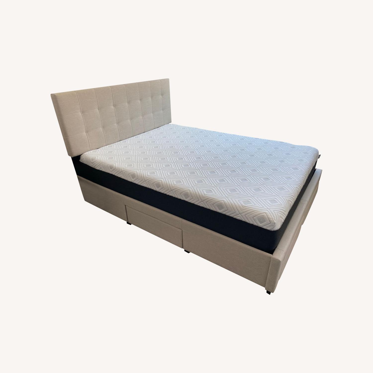 Seller's Notes: STORAGE BED WITH DRAWERS – The four storage drawers on the footboard of this queen bed frame make it easy to keep bed linens, clothes, shoes, and that extra charger nearby for when your phone is on 1%. A beautiful bed with storage underneath? Yes, we thought of everything. STRONG AND DURABLE MATERIALS – This queen bed frame is built from durable, solid wood construction to promote longevity and stability. There’s no box spring needed thanks to the full wooden slats. Plus, the linen-inspired fabric of the upholstery on this beige bed frame really holds up! INTUITIVE & EASY ASSEMBLY- You don’t have to be a carpenter to build this bed. Setting up bedroom furniture like this queen bed frame with a headboard is hassle-free; it comes with all parts, hardware and an easy-to-follow instruction manual included. This bed is designed for easy assembly. THE PERFECT QUEEN SIZE BED FRAME - This queen size bed frame with headboard measures 83.5"L x 64.17"W x 47.24"H. This makes it the perfect size for just about any bedroom, primary suite, or guest room. Use with a queen-size mattress and you’ll be all set for a good night’s sleep.