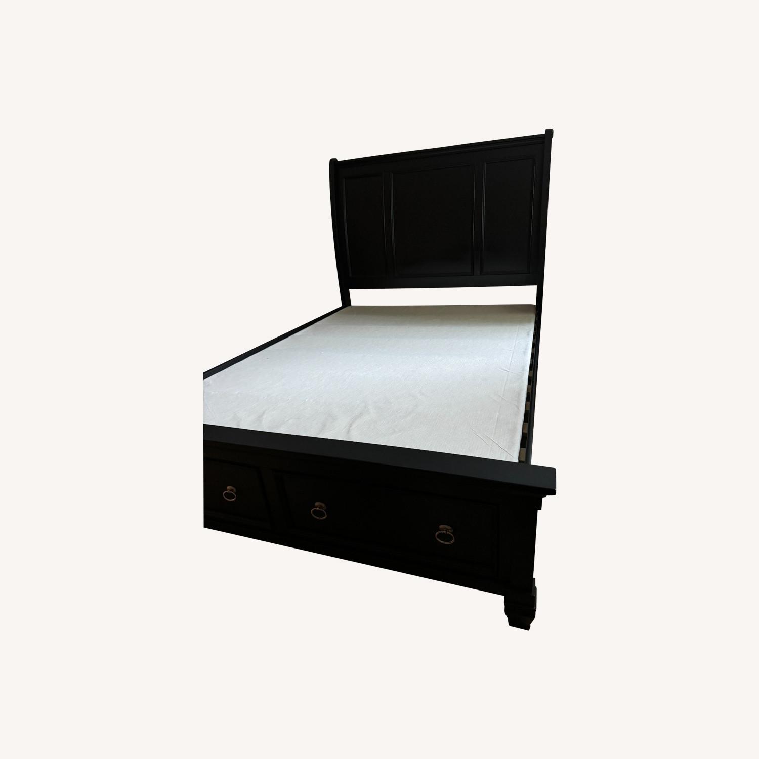 Seller's Notes:This queen-size bed frame, crafted from solid wood, exudes both durability and elegance. In excellent condition, it promises lasting quality and a sophisticated touch to any bedroom. The frame features spacious storage drawers, perfect for stowing away bedding, clothes, or other essentials, making it an ideal solution for maximizing space without compromising on style. With its robust construction and functional design, this bed frame seamlessly blends practicality with timeless appeal. Mattress not included