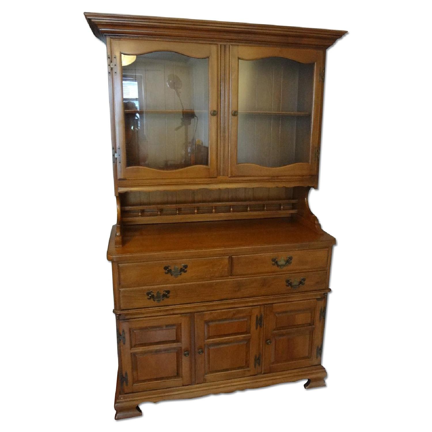 Seller's Notes:Vintage maple hutch / buffet piece in beautiful condition. Lots of storage space. Glass-enclosed shelves up top, 3 drawers and cabinet shelves below. Minor wear on the feet & one scratch (pictured). Separates into two pieces for easy moving: + Top is 47.5" wide, 15" deep, 40" high. + Bottom 44.5" wide, 20" deep, 34.5" high. Made in USA by R. Veal & Sons, Flint Ridge maple 1960-1970.