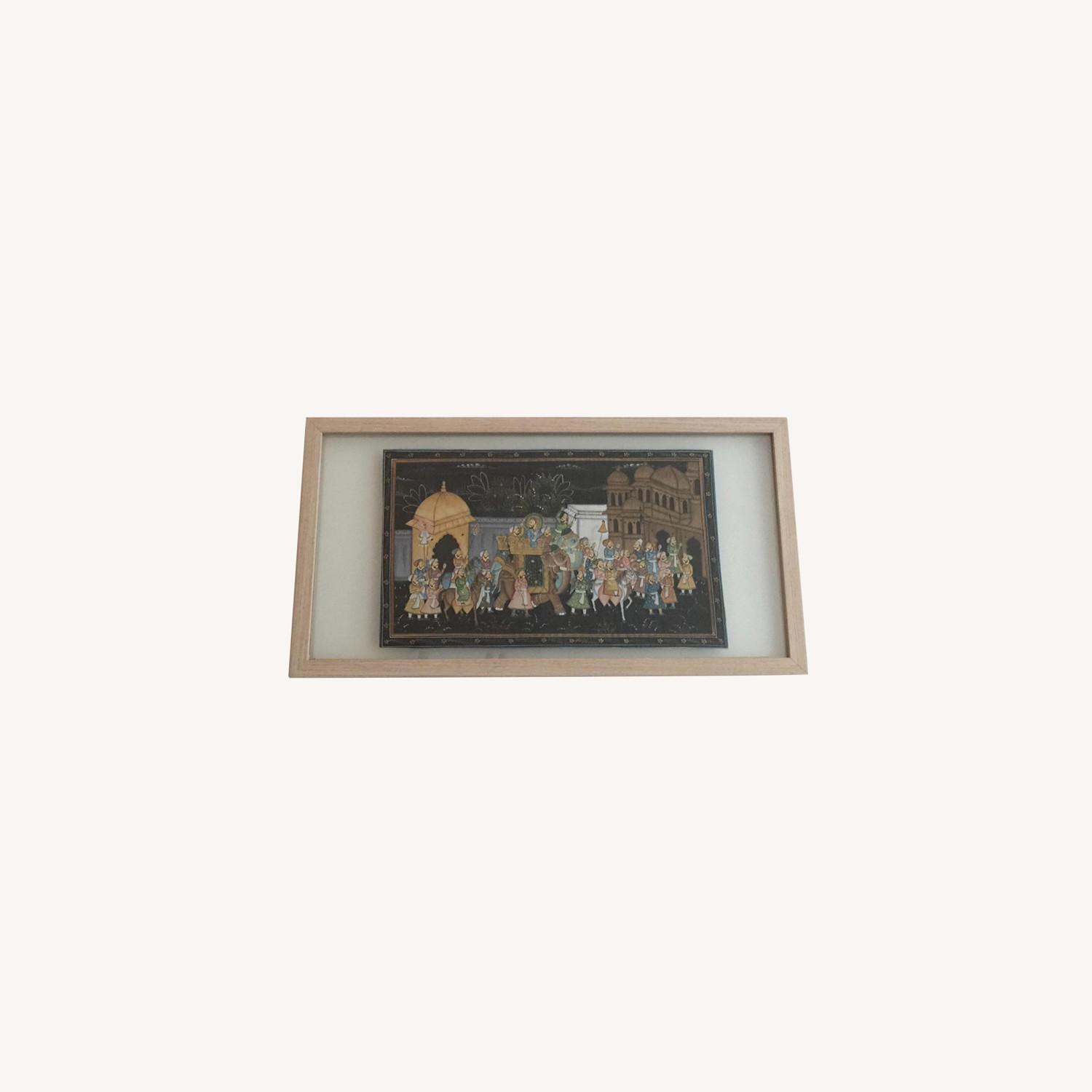 Seller's Notes:Beautiful hand-painted silk depicting a majestic Maharaja procession. An exquisite work of art from the western state of Rajasthan, India. A grand procession is on its way from the palace. There are ministers on horses and the king on the elephant. Some of these skillfully painted pictures have survived till today, narrating to us the uniqueness of those rich times. The painting floats between two glasses that are framed in a bleached wood, creating a unique piece of art.