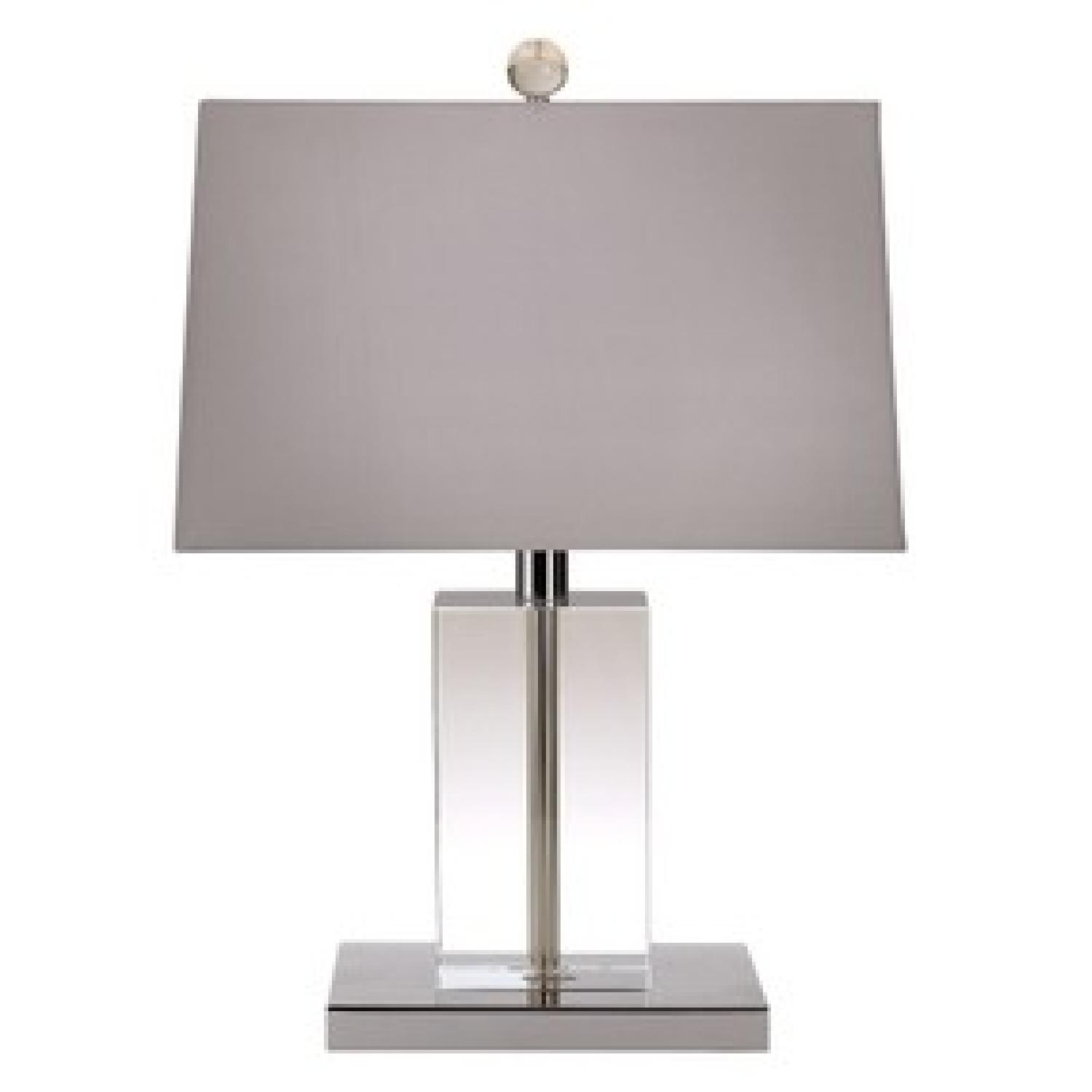 Seller's Notes:From Ralph Lauren Home: Crafted from a clean and simple design of clear Lucite and polished nickel accents, our low table lamp embodies modern luxury. Nickel-plated finish with a warm, polished mirror shine. Includes one grey vellum shade. Max 75 watts; 3-way switch.