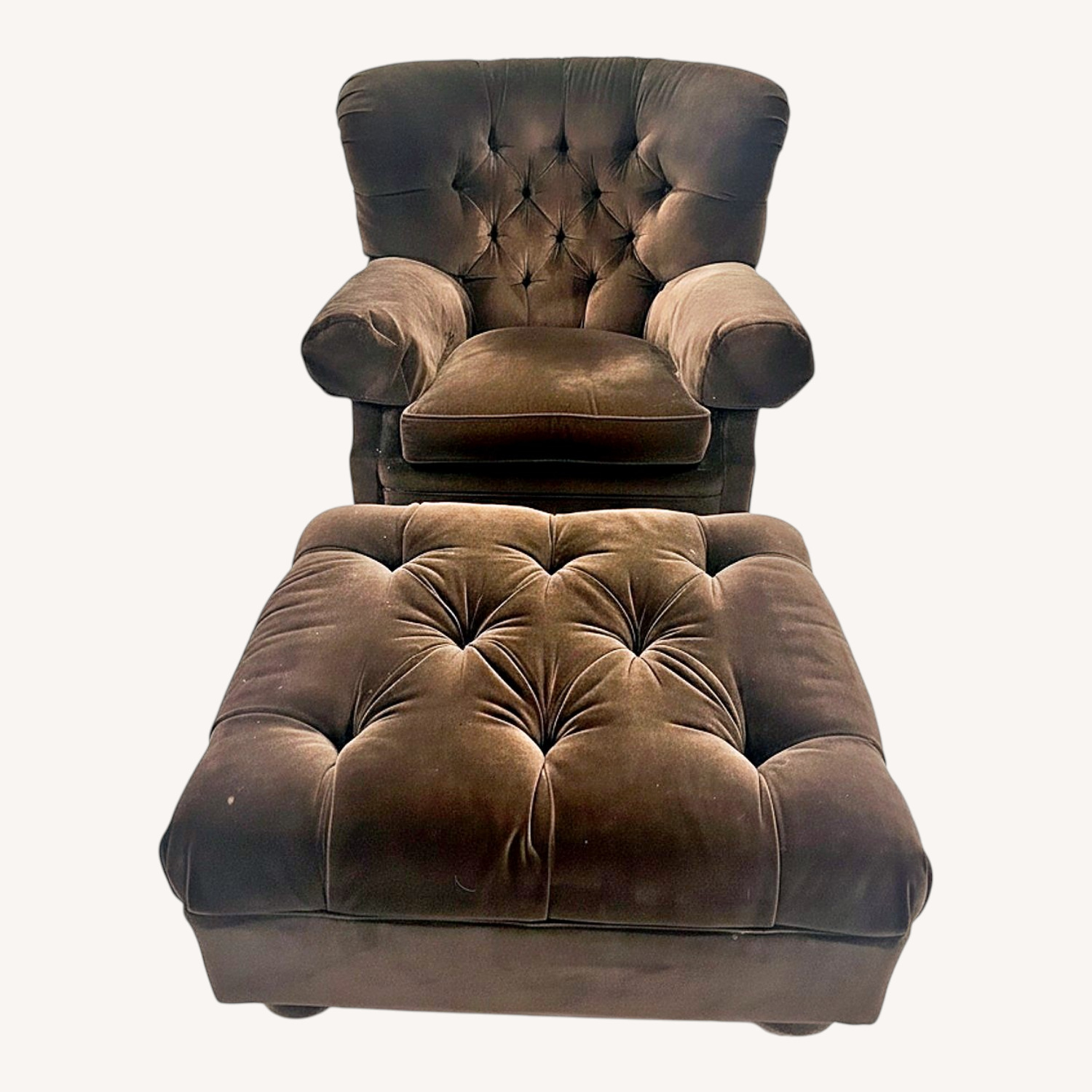 Seller's Notes:A timeless Ralph Lauren Wingback Club Chair upholstered in rich dark brown velvet. This elegant piece features a fully tufted back, classic rolled arms, and refined brass nailhead trim along the base. The chair is generously sized and extremely comfortable, with a plush down-wrapped seat cushion and sturdy bun feet. It comes with a matching ottoman, making it perfect for a living room, office, or reading corner. This is an authentic Ralph Lauren piece with the original label intact, showcasing quality craftsmanship and classic design. Condition is satisfactory with some discoloration and minor seat impressions consistent with age and use, but it remains structurally solid and has many good years ahead. A beautiful vintage statement piece that blends perfectly with both traditional and modern interiors.