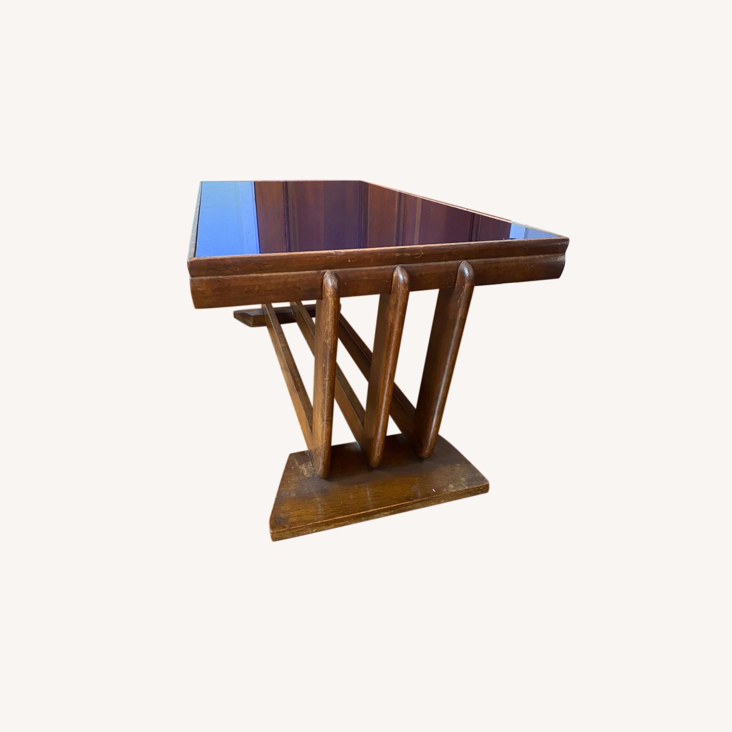 Seller's Notes:LAST CHANCE: Rare 1940s blue glass coffee table caught our eye when we moved here, but we are moving away and need to pass on this unique piece of furniture. Table is solid. Shelf underneath for books, magazines, etc. Blemishes on wood and glass.