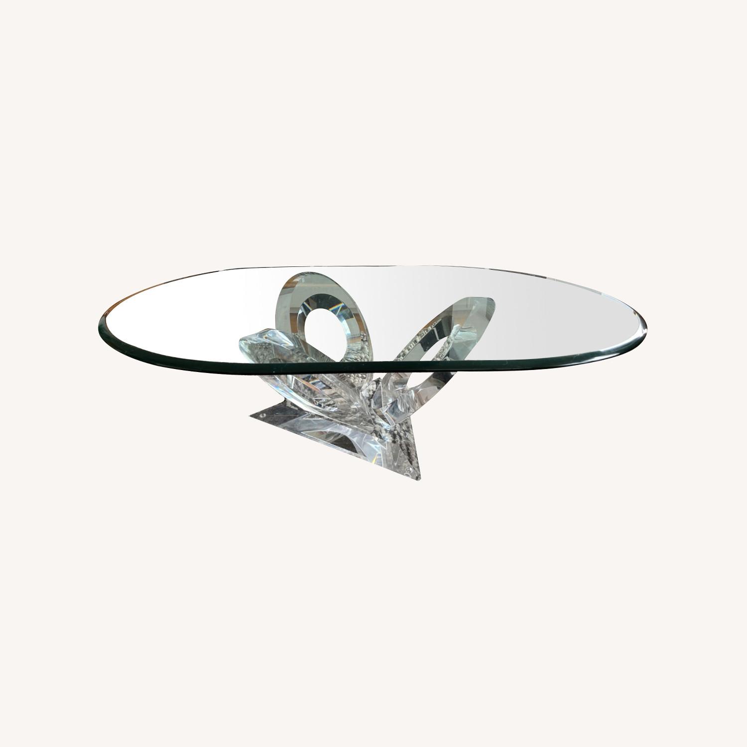 Seller's Notes:Rare and exquisite 20th century Postmodern Hollywood Regency Lucite Coffee Table signed and dated by the artist. This oval coffee table is on a sculptural base, composed of looped Lucite. Markings include "Eclipse of Time"™ / ©1990 Mikhail Loznikov / US Patent no: 333,395, signed to the Lucite base. It had a suggested retail price of ~$5,000. The same table is listed on 1st Dibs for $3,499 and on eBay for $1,800. Price includes the beveled glass top and base. There are a few scratches on the glass and the base is in very good condition. Oval top may be replaced with a smaller round glass top.