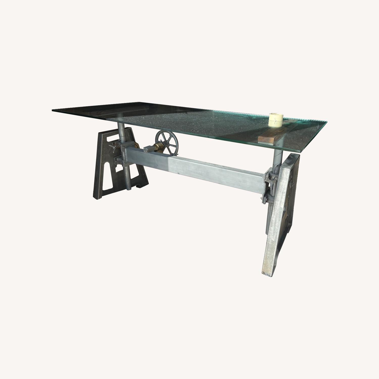 Seller's Notes:Museum-grade industrial piece built on a cast iron lift base from the early twentieth century. The dual screw columns and crank mechanism allow smooth height adjustment. The base shows original casting codes R 975D and WAZP205. The glass top creates a clean, modern contrast with the original machinery. This works as a statement desk, a gallery table, or a design anchor in a loft or creative space. Details • Authentic cast iron industrial lift base • Functional hand-crank height adjustment • Dual threaded columns • Original casting, no reproduction parts • Thick glass top • Strong architectural presence • One-of-one look