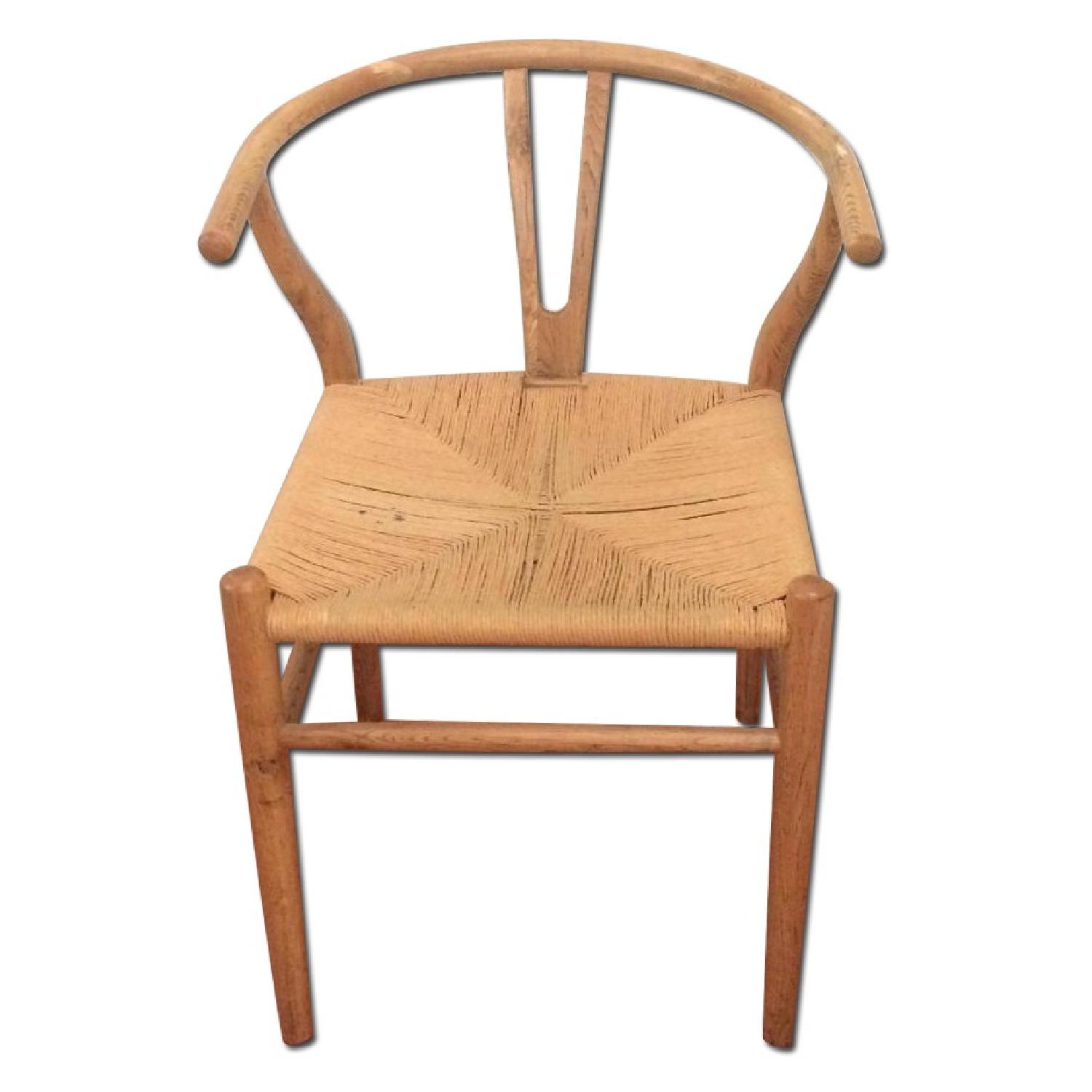Seller's Notes:Four Wishbone / Wegner-style dining chairs available, good condition! Superbly made, solid oak with rattan seats. Some minor wear on the rattan seats, but very beautiful and in good shape!