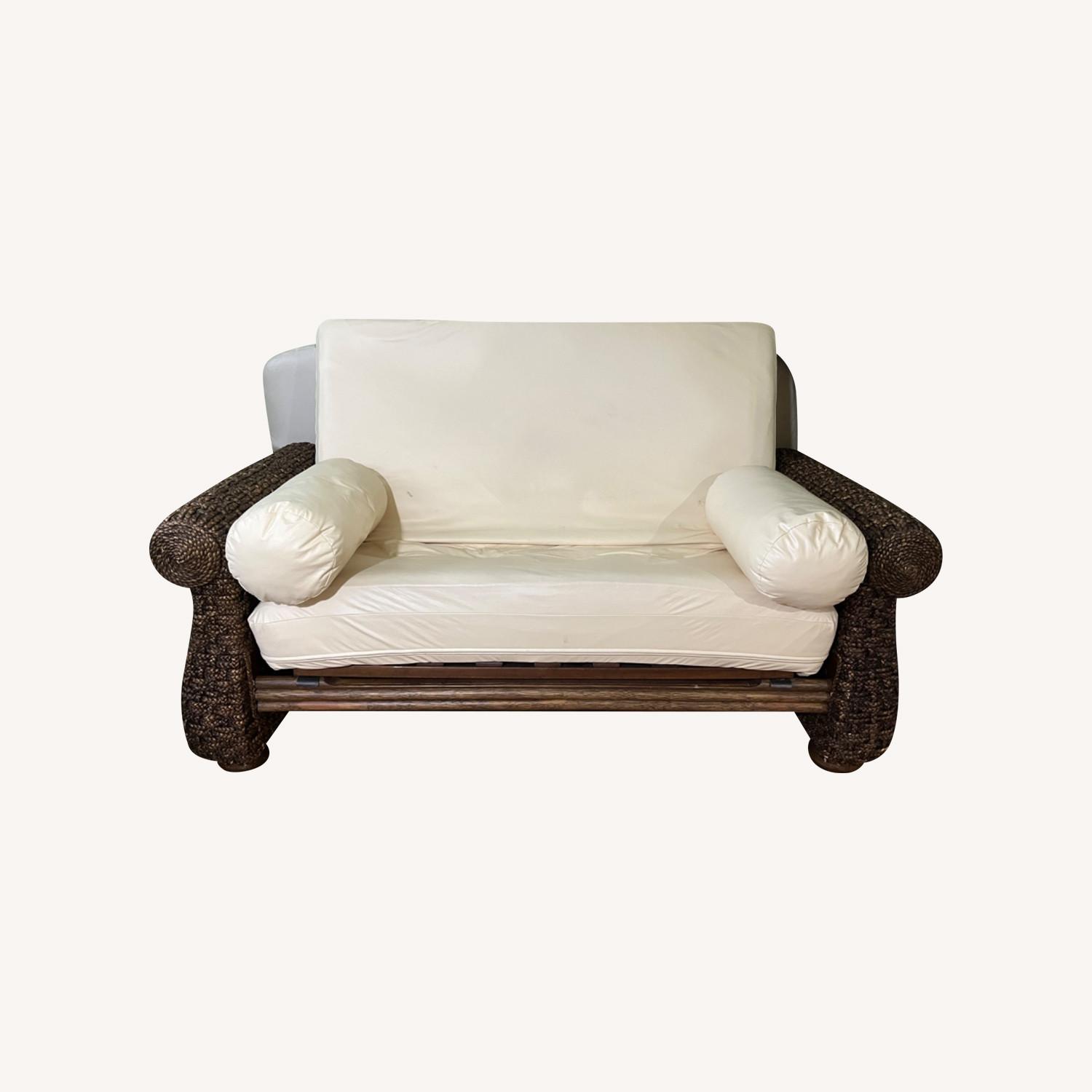 Seller's Notes:Selling a Beautiful, Tropical Style Iris Rattan Full Size Futon Lounger Discontinued, but was Manufactured by Day & Night. Comes with a New 8” Otis brand Moonshadow Mattress. Both Futon and Mattress are Like New. The faux leather mattress cover shown in the pictures does need to be replaced, but the mattress itself, is in New Condition. Slept on twice. Very sturdy and built to last. Real wood. Makes a beautiful loveseat, comfy lounger, or comfortable full size bed. This is a versatile piece, so you can cover mattress to suit your decor.
