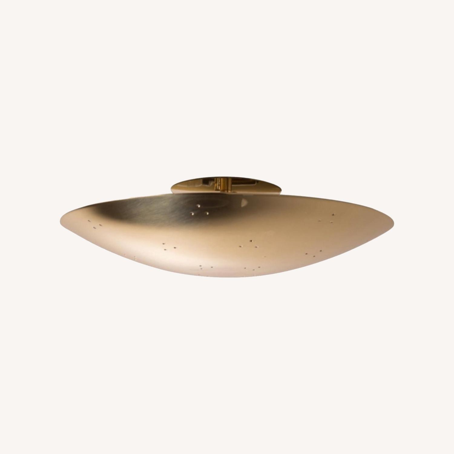 Seller's Notes:Hand-fabricated in Los Angeles, this highly refined ceiling lamp is reminiscent of the iconic Mid-Century Finnish designs of Paavo Tynell and Lisa Johansson Pape. Executed in perforated brass with a patinated brass finish on canopy and stem. Lamp accommodates 3x maximum 60W equivalent e26 medium base LED bulbs. Dimmable according to bulb. This lamp is UL listed.