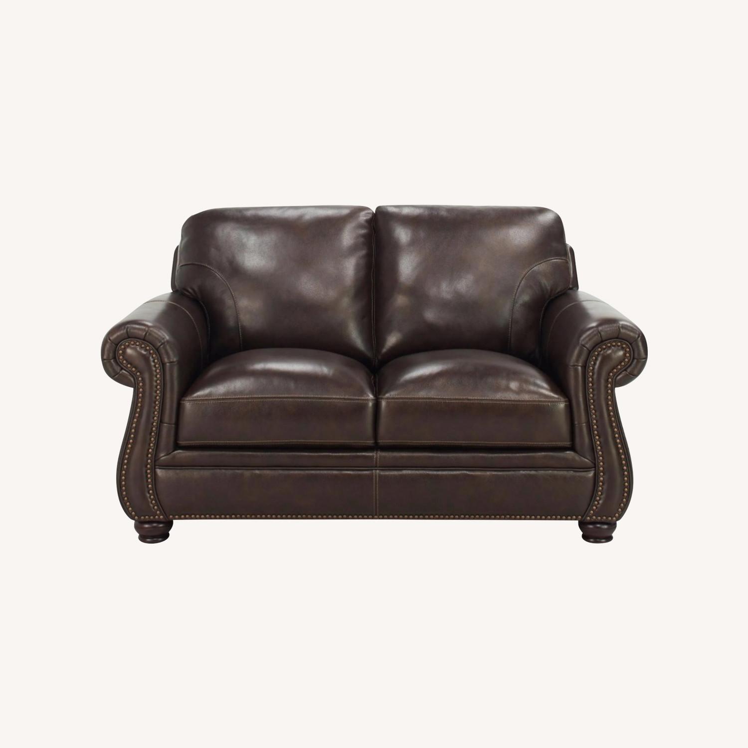 Seller's Notes:If you're looking for traditional charm, there's no better way to get it than the Alistair leather loveseat. Top-grain leather seating provides high-class comfort and durability, while rolled arms and nailhead trim really catch the eye.