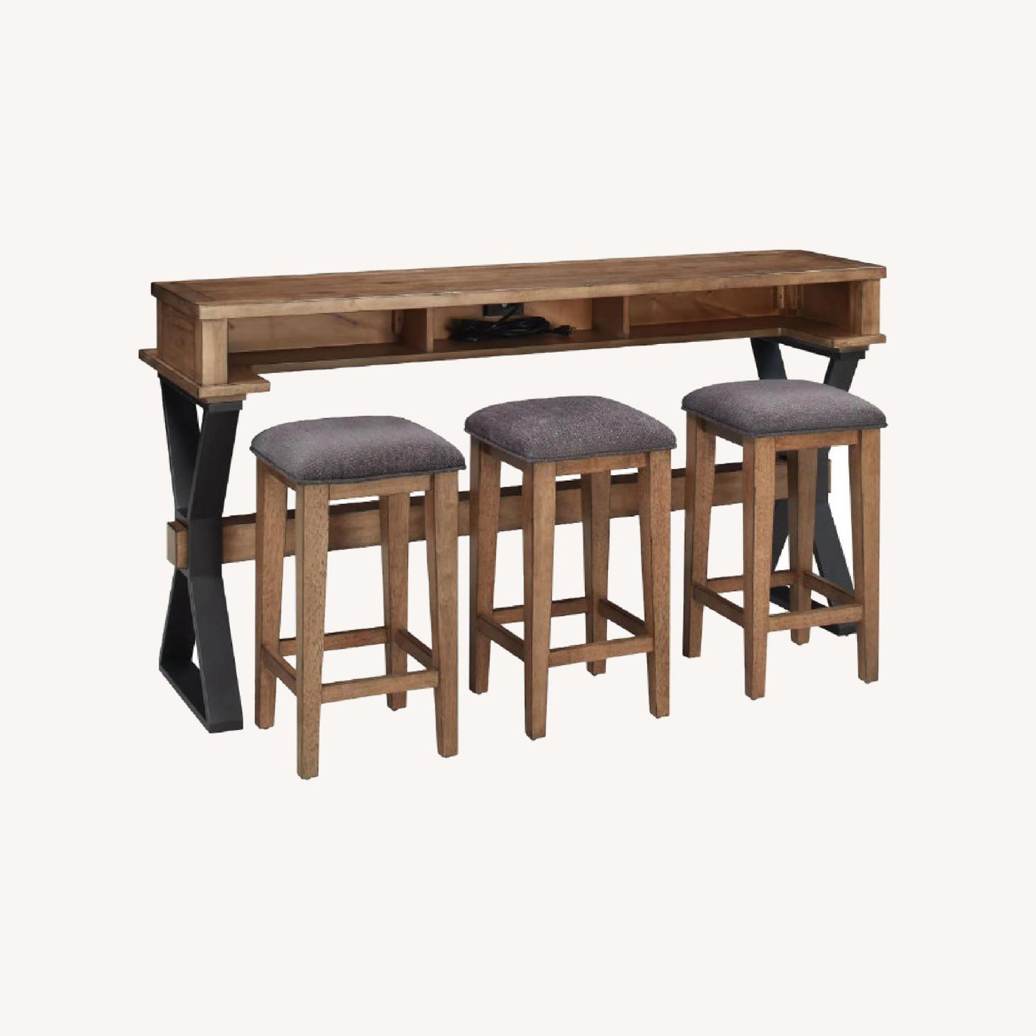 Seller's Notes:Barely used, perfect condition console table with 3 stools. Purchased one year ago for $749 Bay Ridge 4-Piece sofa console table with stools dishes up rustic character and farmhouse style thanks to its distressed finish and rustic aesthetic. Bay Ridge Anywhere Dining / Sofa Console Table L: 68" x W: 21" x H: 36" Weight: 94 lbs. Maximum Weight Capacity: 150 lbs. Stools L: 14" x W: 14" x H: 26" Weight: 14 lbs. Maximum Weight Capacity: 300 lbs. Dining Height: Counter Height Includes outlet and USB plug in